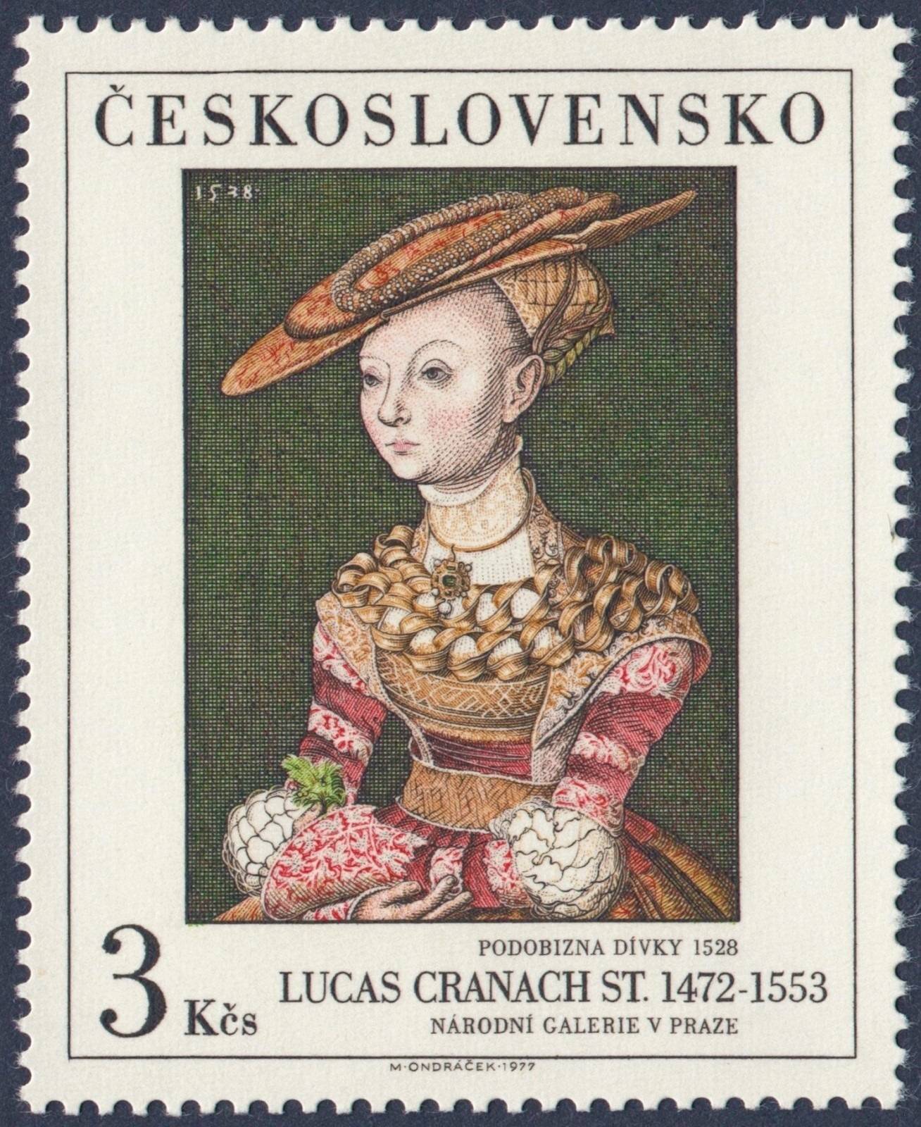 Checoslovaquia, 1977, Arte, “Retrato de una joven sosteniendo un helecho” (1528), de Lucas Cranach. Sello diseñado y grabado por Miloš Ondráček. Calcografía