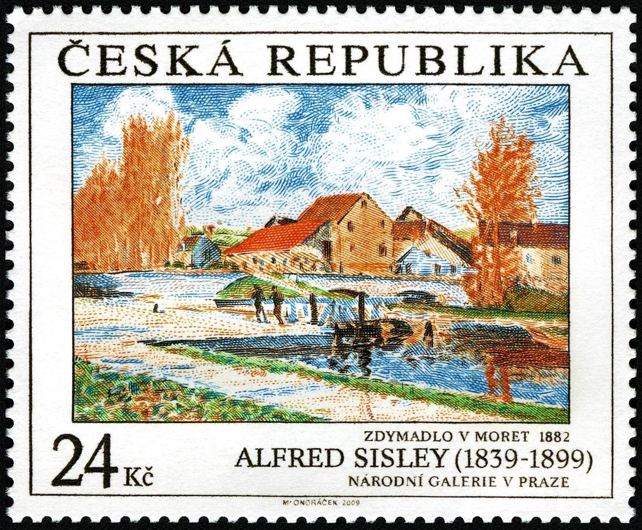 República Checa, 2009, Arte, “El bloqueo de Bourgogne en Moret” (1882), de Alfred Sisley. Sello diseñado y grabado por Miloš Ondráček. Calcografía