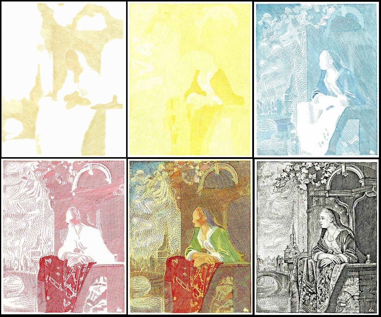 Sobre estas líneas vemos en una secuencia, de izquierda a derecha, las cuatro pruebas de las matrices que transfieren los colores para el sello de Gerrit Dou (2016), una prueba del registro de color, y en último lugar otra prueba de imprenta de sólo el negro.