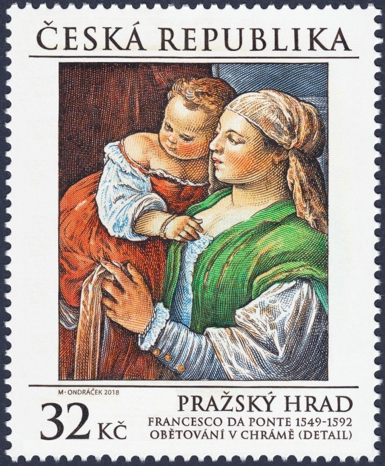 República Checa, 2018, Arte, “Sacrificio en el templo”, detalle, de Francesco da Ponte Bassano. Sello diseñado y grabado por Miloš Ondráček. Calcografía