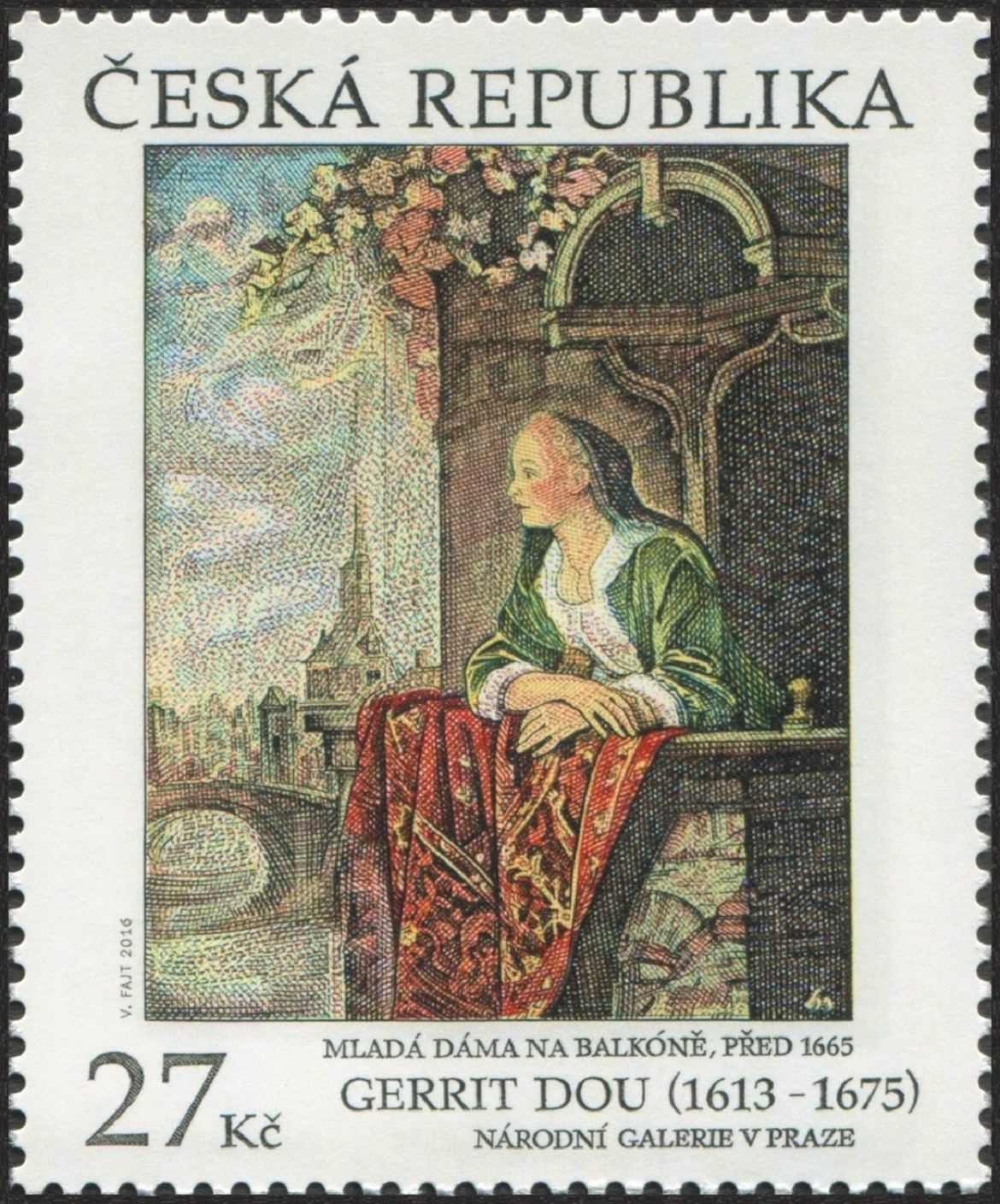 República Checa, 2016, Arte, “Joven en su balcón”, de Gerrit Dou, pintor barroco. Sello diseñado y grabado por Václav Fajt. Calcografía