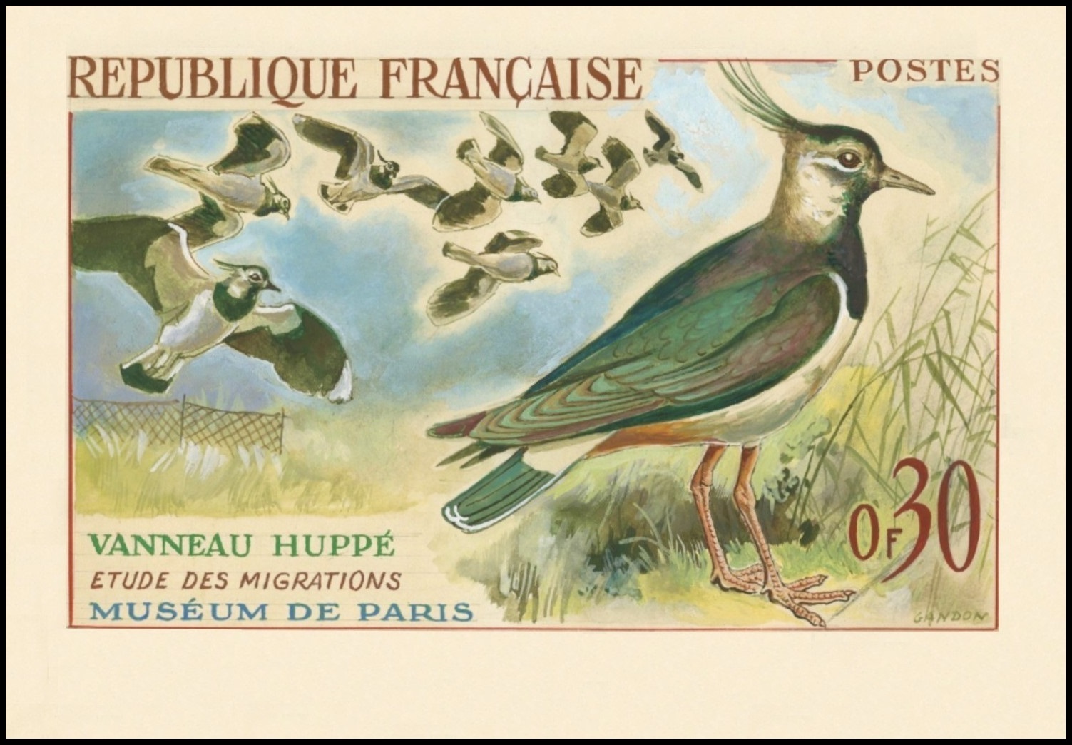 Francia, 1960, Estudio de las migraciones, Museo de París, Vanneau Huppé (Vanellus vanellus, avefría europea). Serie de 4 sellos. Sello diseñado por Pierre Gandon y grabado por Charles Mazelin; calcografía. Arriba, el proyecto adoptado (gouache y lápiz) de Gandon y al que finalmente el artista hizo algunos retoques