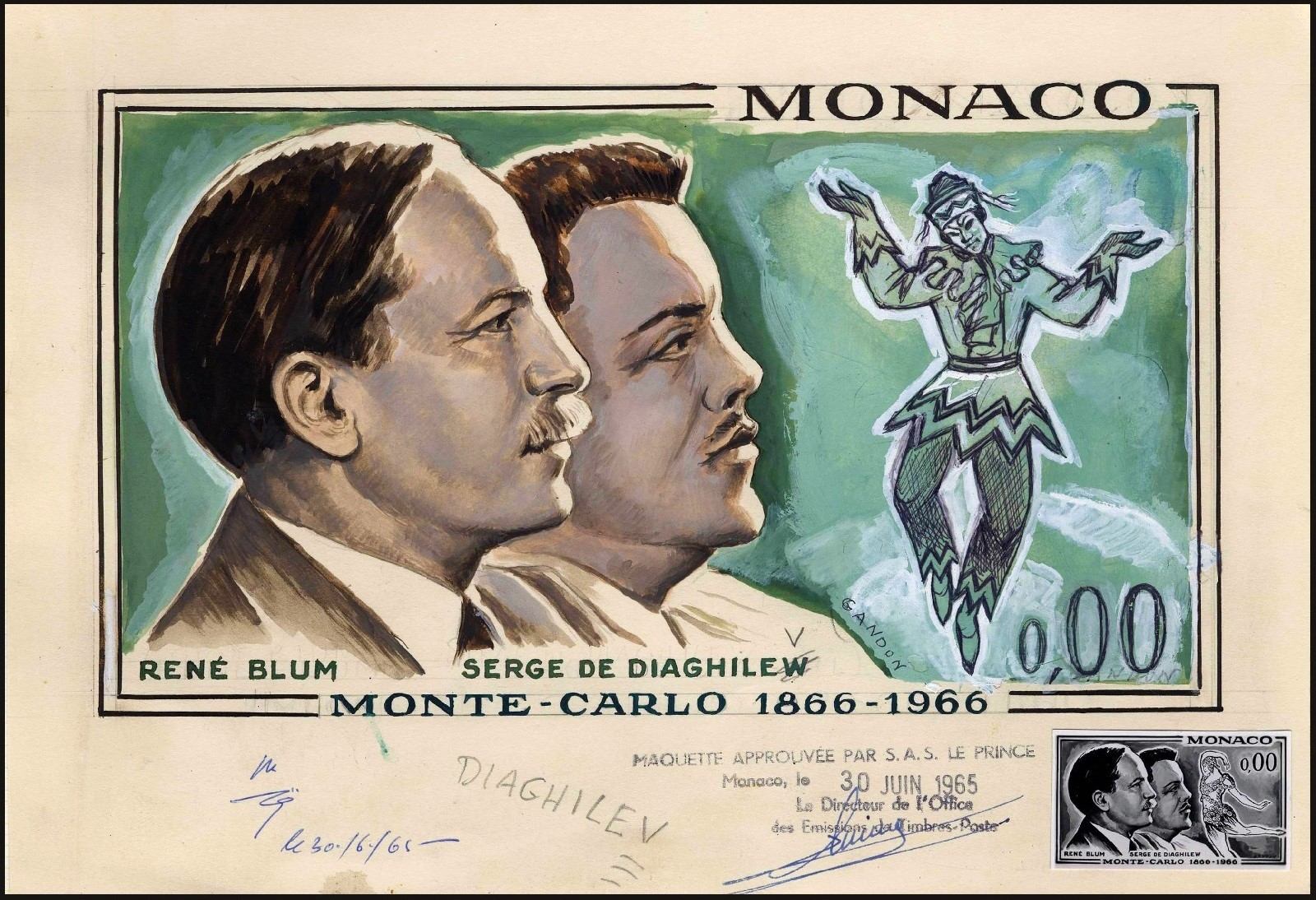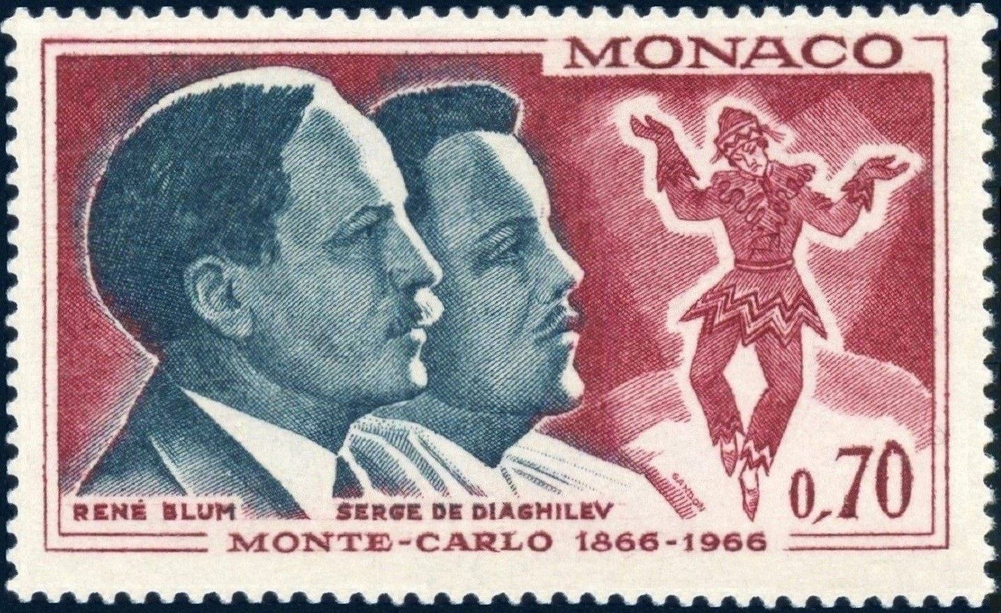 Mónaco, 1966, Centenario de la fundación de Montecarlo. René Blum y Serguéi Diáguilev. Sello diseñado y grabado por Pierre Gandon; calcografía. En primera instancia, el diseño original de Gandon para este sello