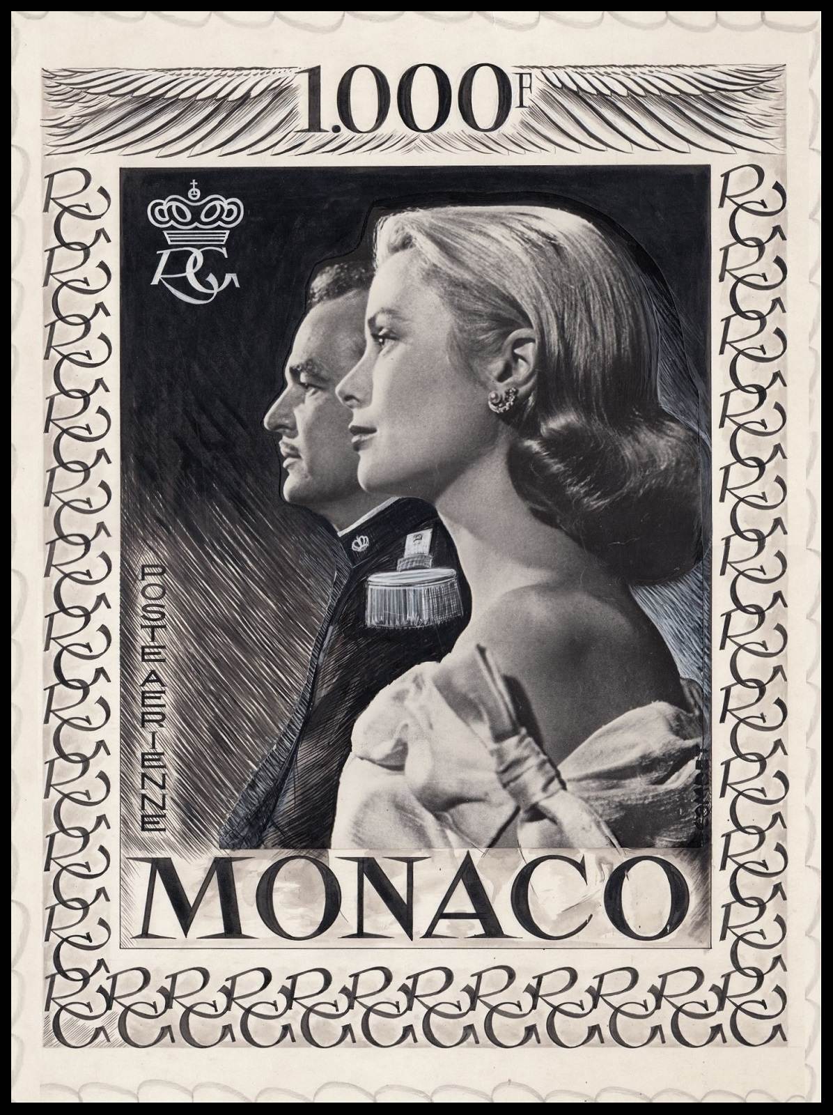 Mónaco, 1959, Correo Aéreo, Rainiero III y Grace Kelly. Sello finalmente emitido en dos valores calcográficos, diseñado y grabado en 1959 por Jules Piel
