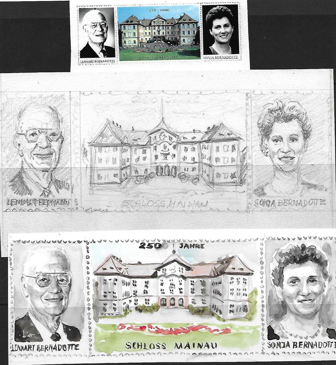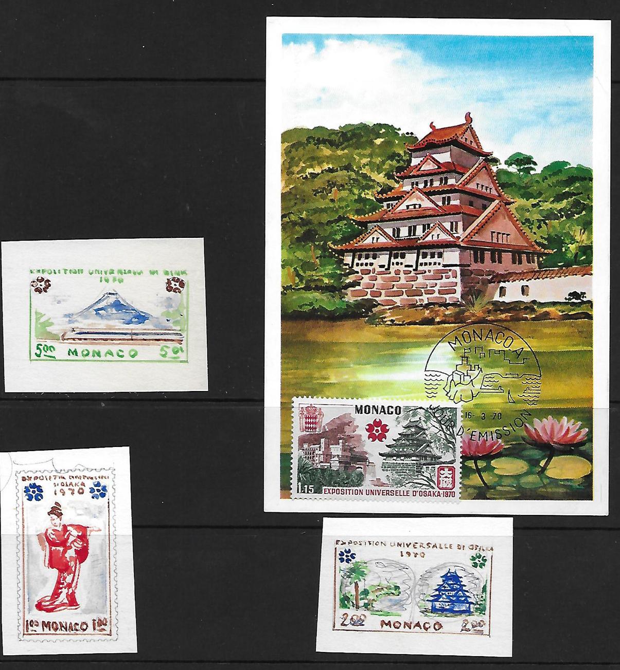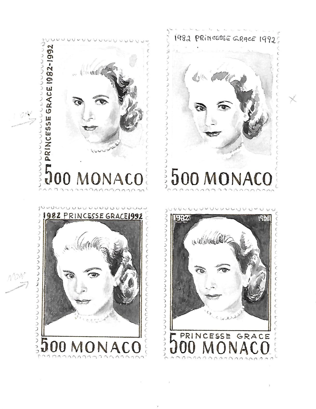 O las acuarelas que no fueron aceptadas para una serie de Mónaco y que el grabador y/o diseñador definitivo no varió mucho