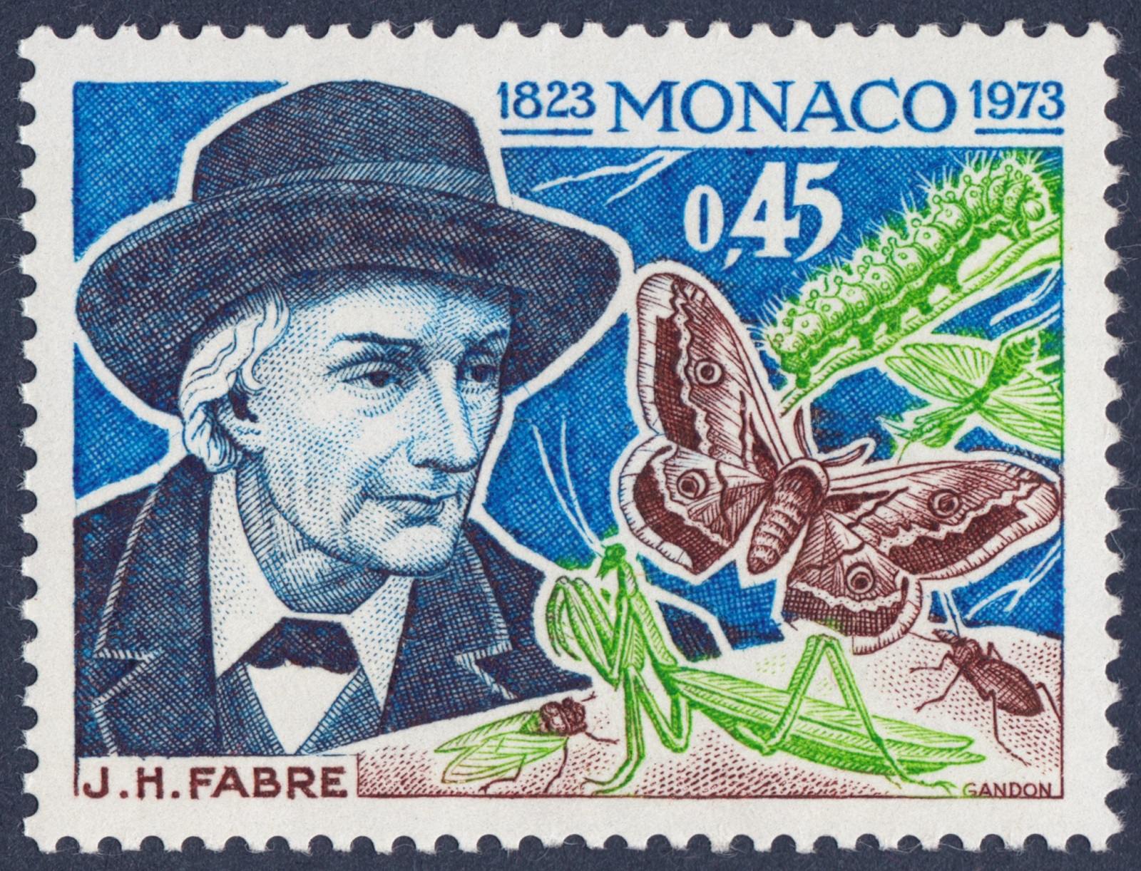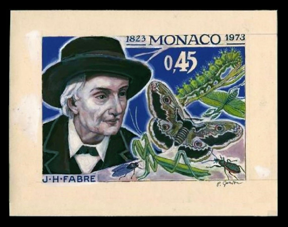 Mónaco, 1973, Jean-Henri Fabre. Diseño original adoptado y sello emitido, después del grabado a buril de Pierre Gandon. Calcografía