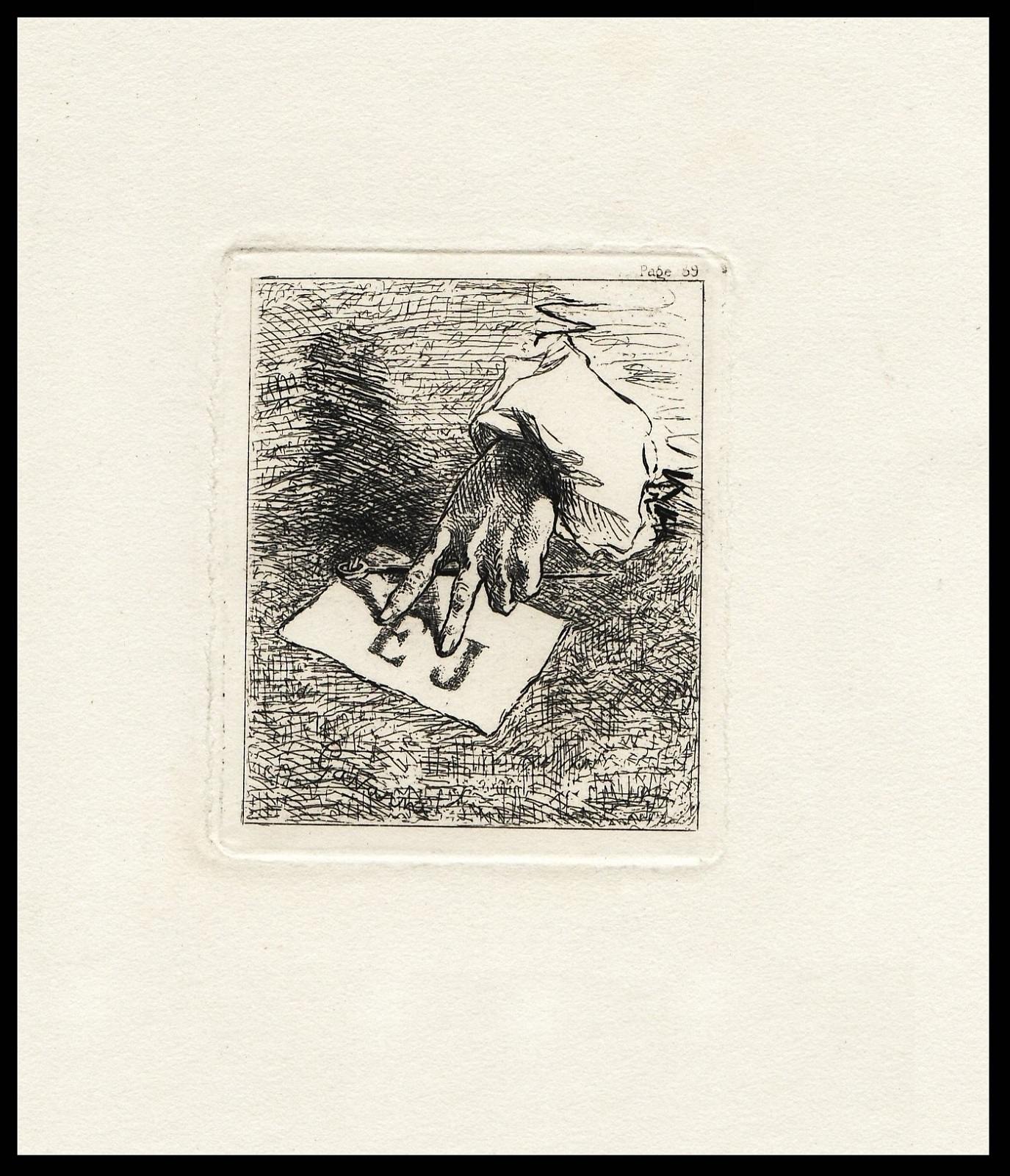 Ex libris que Paul Cavarni creó para los hermanos Goncourt y en el que se inspiró Gandon para el diseño del sello anterior