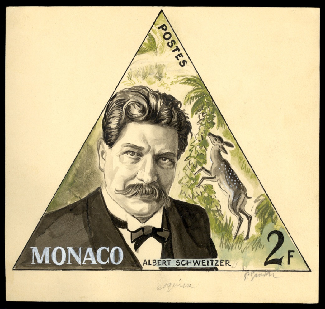 Mónaco, 1955, Albert Schweitzer. Sello diseñado por Pierre Gandon y grabado por Henry Cheffer; calcografía. En primera instancia, el diseño de Gandon para este sello, que en un principio parecía que iba a ser de forma triangular