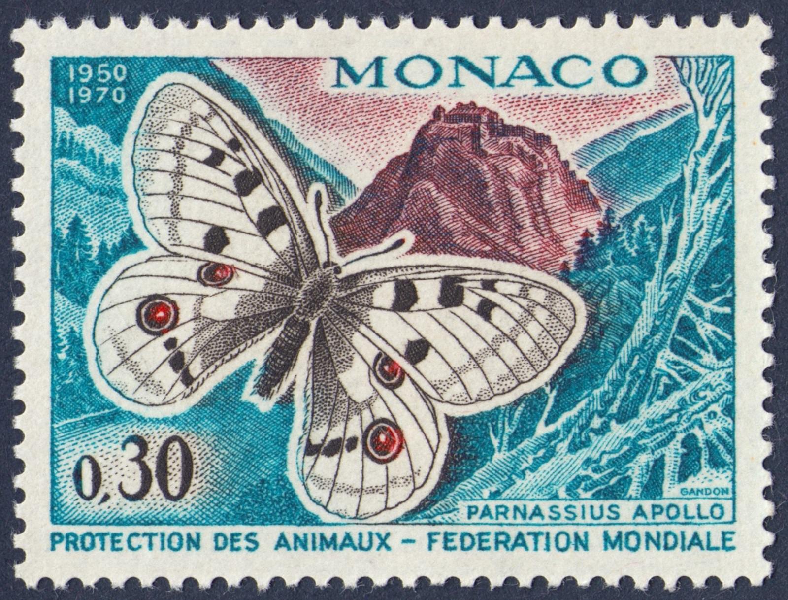 Mónaco, 1970, Federación Mundial para la Protección de los Animales. Mariposa Parnassius apollo. Sello diseñado y grabado por Pierre Gandon. Calcografía