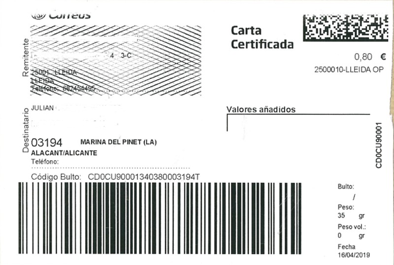 La tarifa de 5,00 euros, se cubre con un franqueo en sello de 2,00 + 0,35 + 0,30 + 1,40 (Tarifa B) + 0,85 que suman 4,90 euros más los 0,10 euros de la etiqueta.