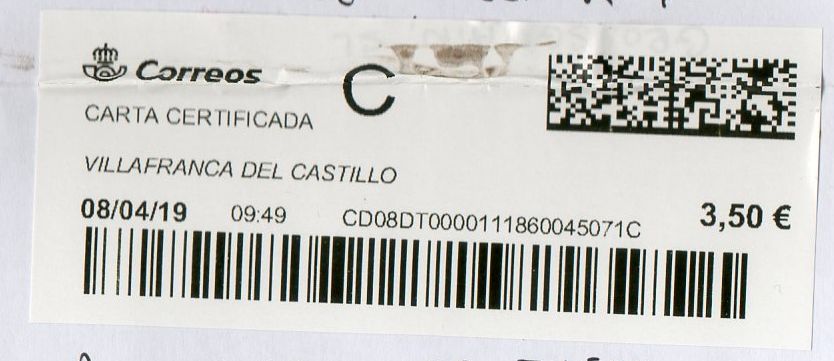 VILLAFRANCA DEL CASTILLO / CARTA CERTIFICADA / 08-04-19