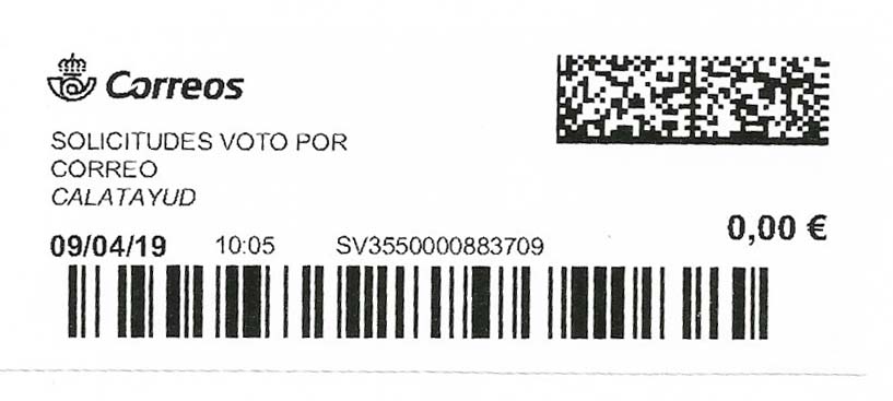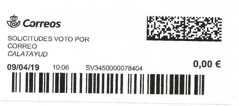 Los envíos postales circulan como correo certificado urgente e incluyen en el número de identificacion las claves para diferenciarlas. Así la Solicitud de Voto por Correo se identifica por la siglas SV seguidas del número 34 para la Elecciones Municipales y el número 35 para las Generales. Le sigue el código postal provincial -en el caso de las de Calatayud el 50000 identificativo de la provincia de Zaragoza- y el número de envío.