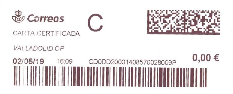 Etiqueta térmica digital. Nueva. Valladolid OP. Carta certificada. 2019-05-02. 16.09. 4,1x10. 0,00 euros. Carta. Baja.jpeg