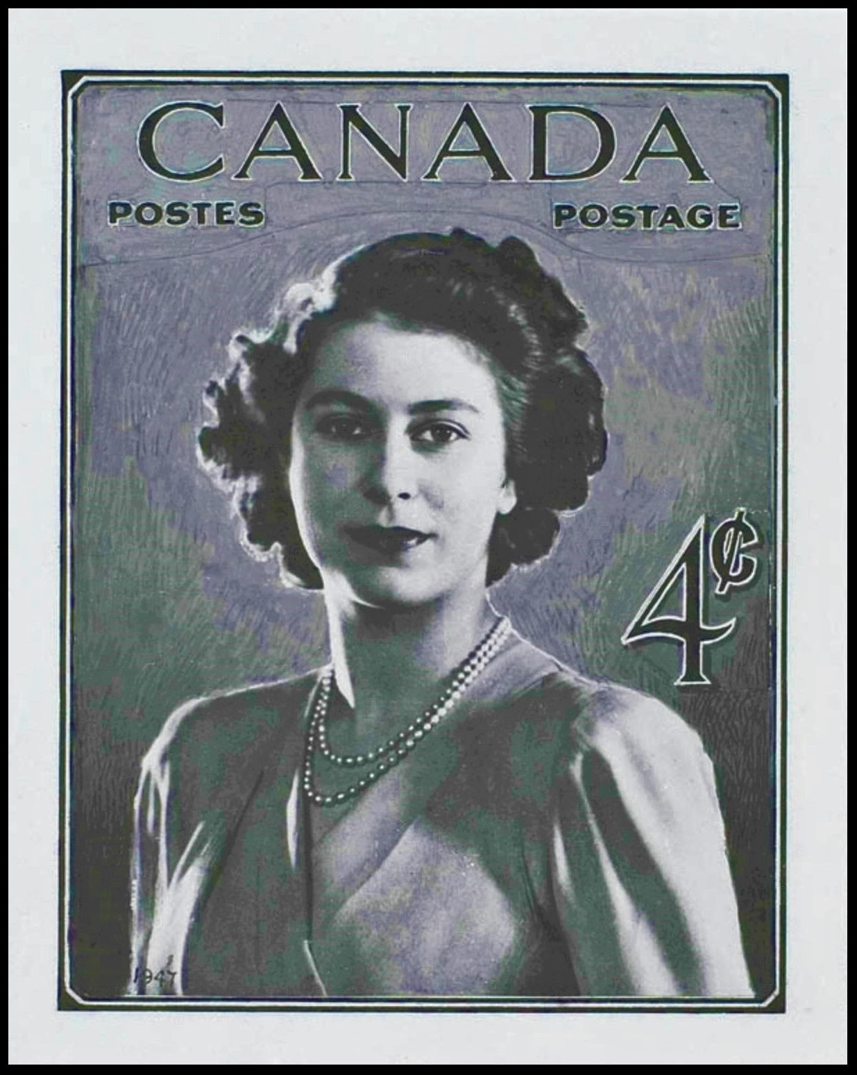 - Fotografía de la joven princesa Isabel realizada por Dorothy Wilding en 1947, y elegida unos meses después para el diseño del sello canadiense de 1948 por Herman Herbert Schwartz