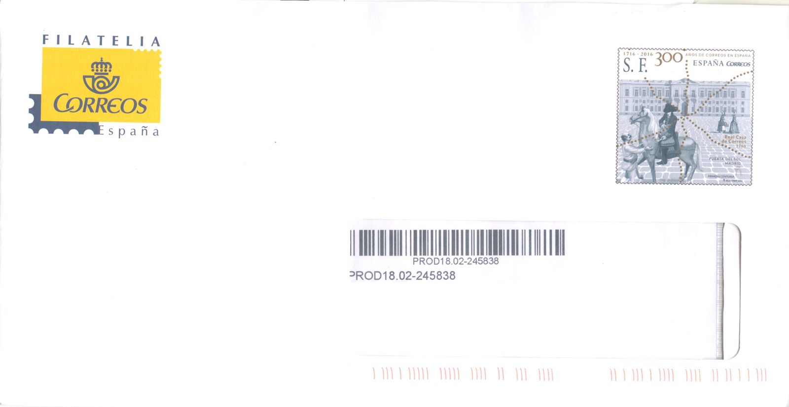 - Sello reproducido: Sin catalogar (ya que únicamente aparecen estos sobres en el Catálogo Especializado). Reproduce el sello que figura en la hoja bloque emitida el 29/02/2016 dedicada a conmemorar los "300 años de Correos en España (1716-2016). Puerta del Sol. Primera Centuria. 1716-1816"".