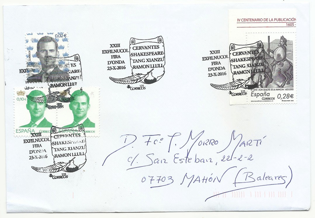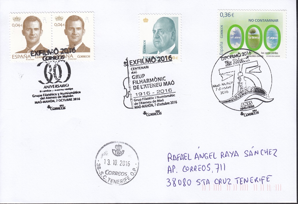 Un Buen Amigo, desde Mahón, me invita a participar de nuevo en este hilo, con una carta que muy amablemente me remite y que me incita de nuevo a volver a "FOMENTAR LA FILATELIA CON EL USO DE LOS SELLOS" y en este caso con múltiples matasellos (Tres) en la misma, de la reciente exposición EXFILMO 2016, celebrada en dicha Ciudad.