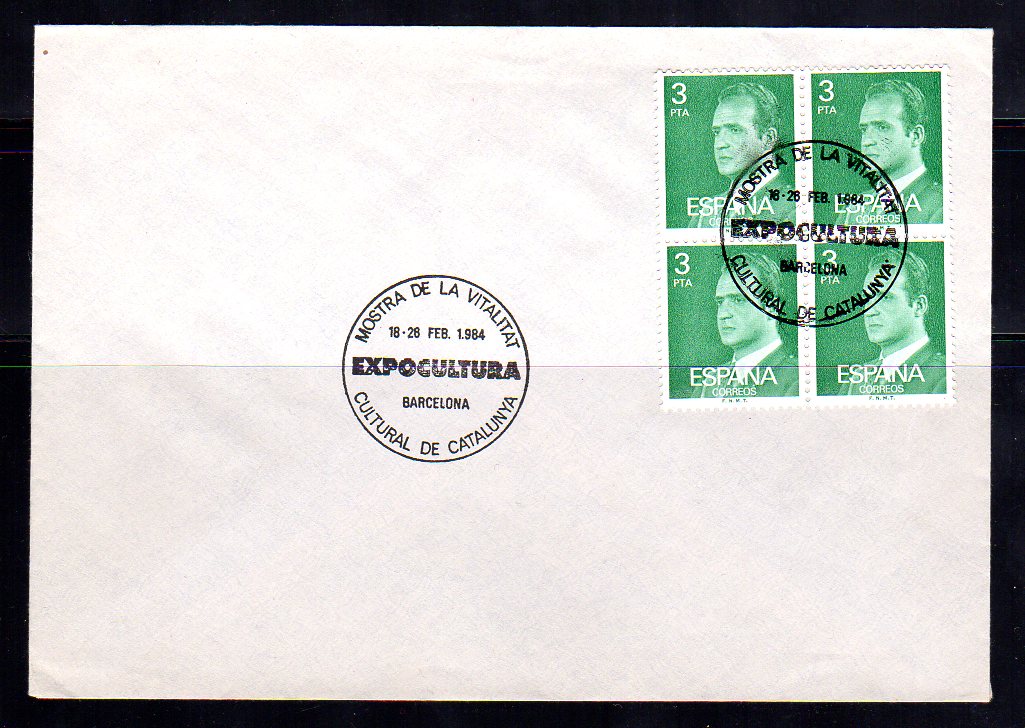 Sobre con bloque de 4 del 3 pta. Rey Juan Carlos I con matasellos Expocultura