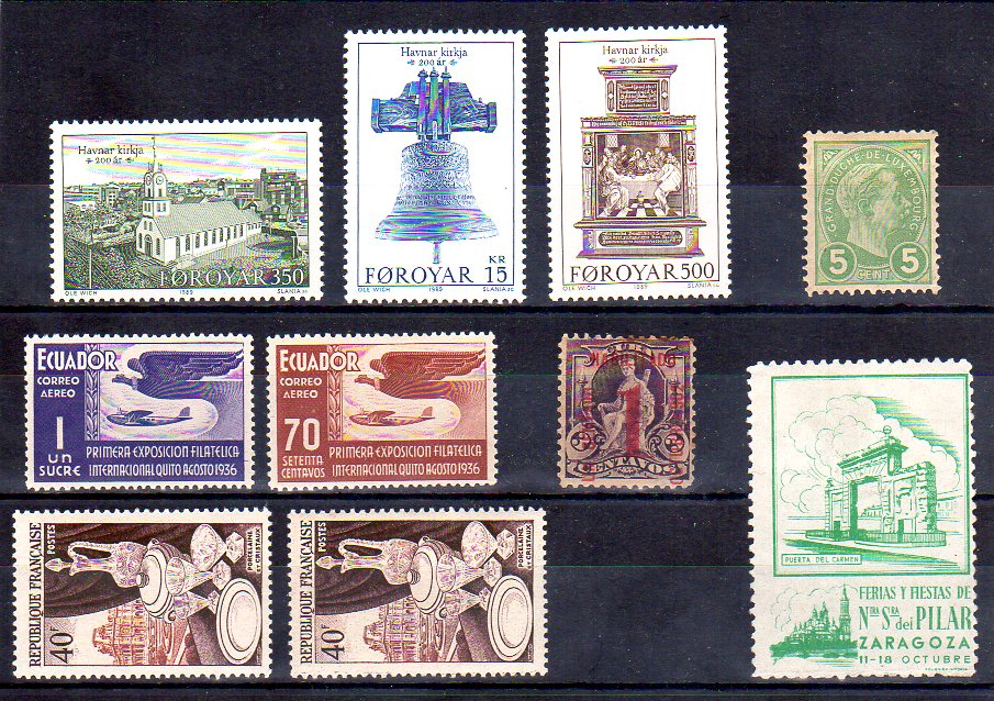 Sellos de Islas Feroes, Ecuador, Francia, Luxemburgo, Cuba y viñeta Fiestas del Pilar