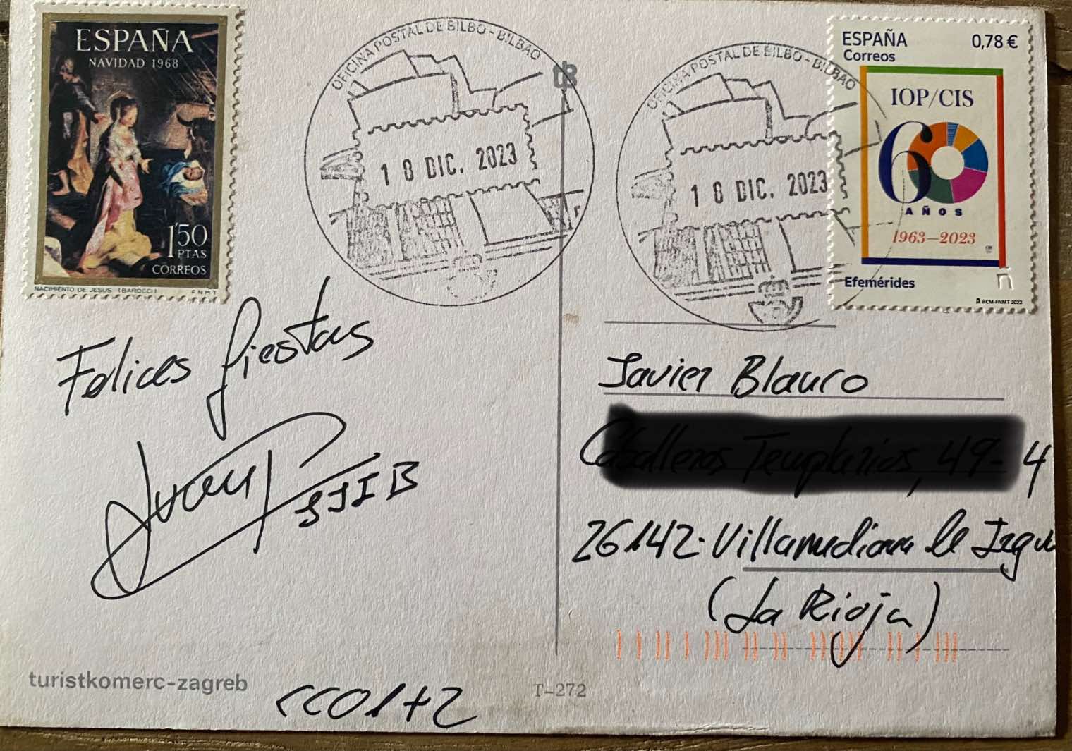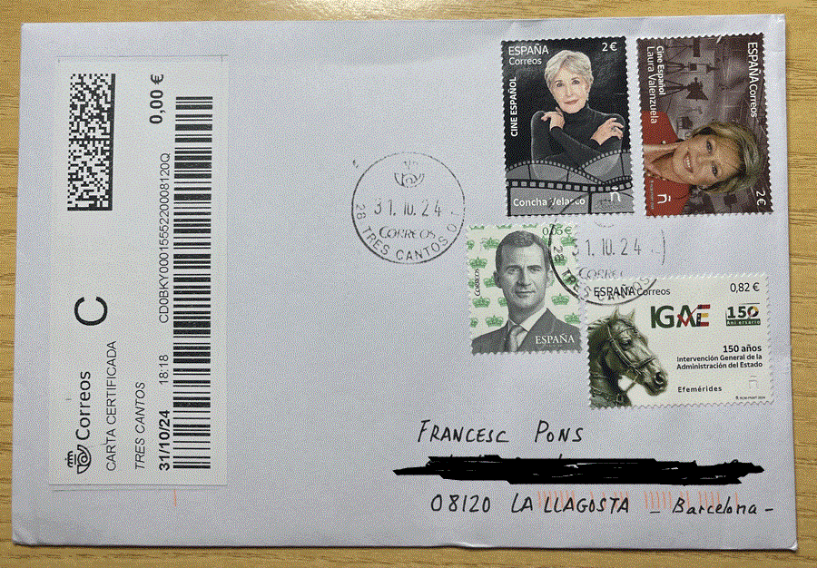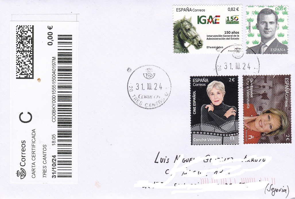 Recién recibida de José Luis, este bonito certificado con sellos de Concha Velasco, Laura Valenzuela, IGAE y básica Felipe VI para completar el franqueo Correcto