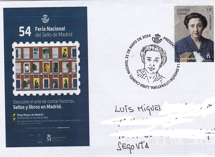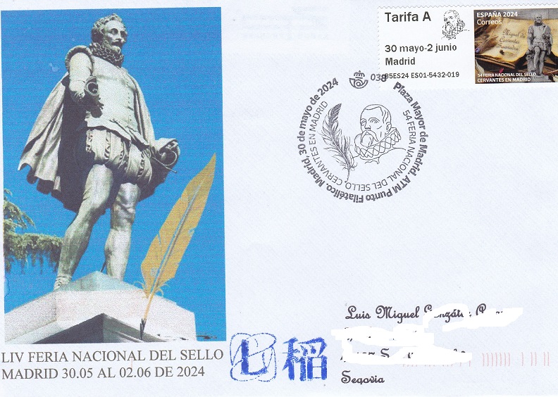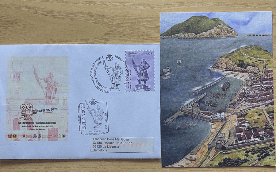 Y también recibida hace unos días carta de Carlos, también desde la Exfilna con el sello de 7,60€ de la HB de dicho evento, en el que se muestra la estatua de Pedro Ansúrez. Matasellos preciosos y sobre ilusrado. Muchas gracias