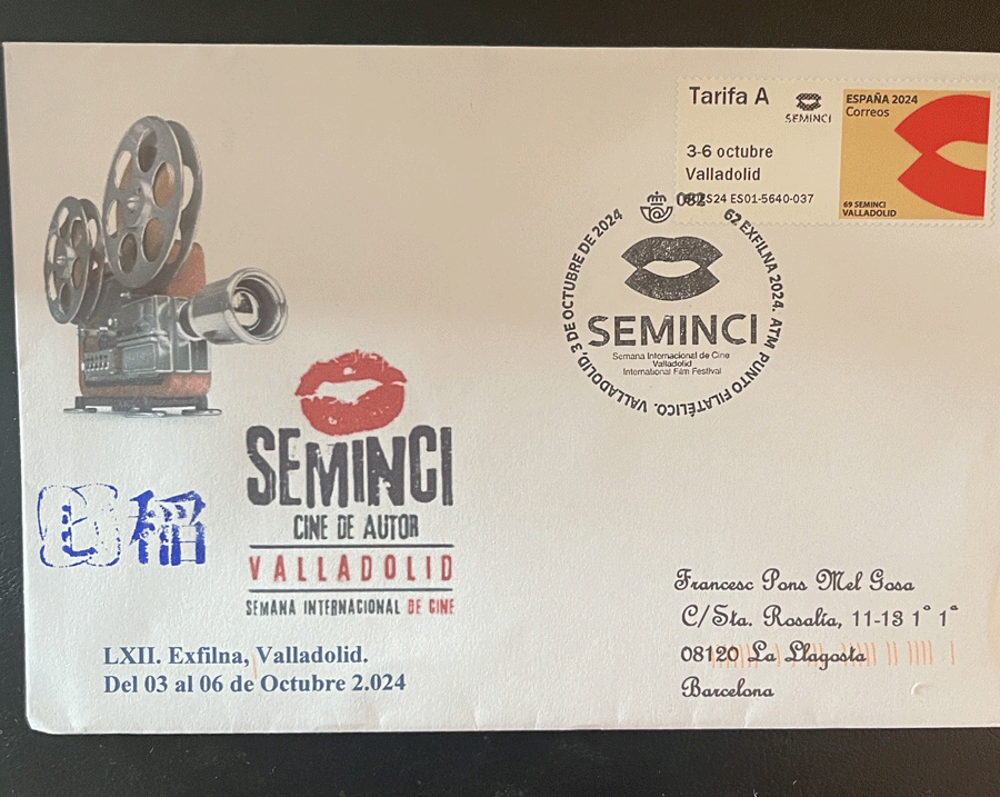 Dos cartas de L&M desde la Exfilna en Valladolid, con los sellos Tarifa A, el del Castillo de Peñafiel y el de la Seminci. Ambos muy bien matasellados y con los sobres ilustrados en ese estilo habitual y muy logrado del amigo Luis:
