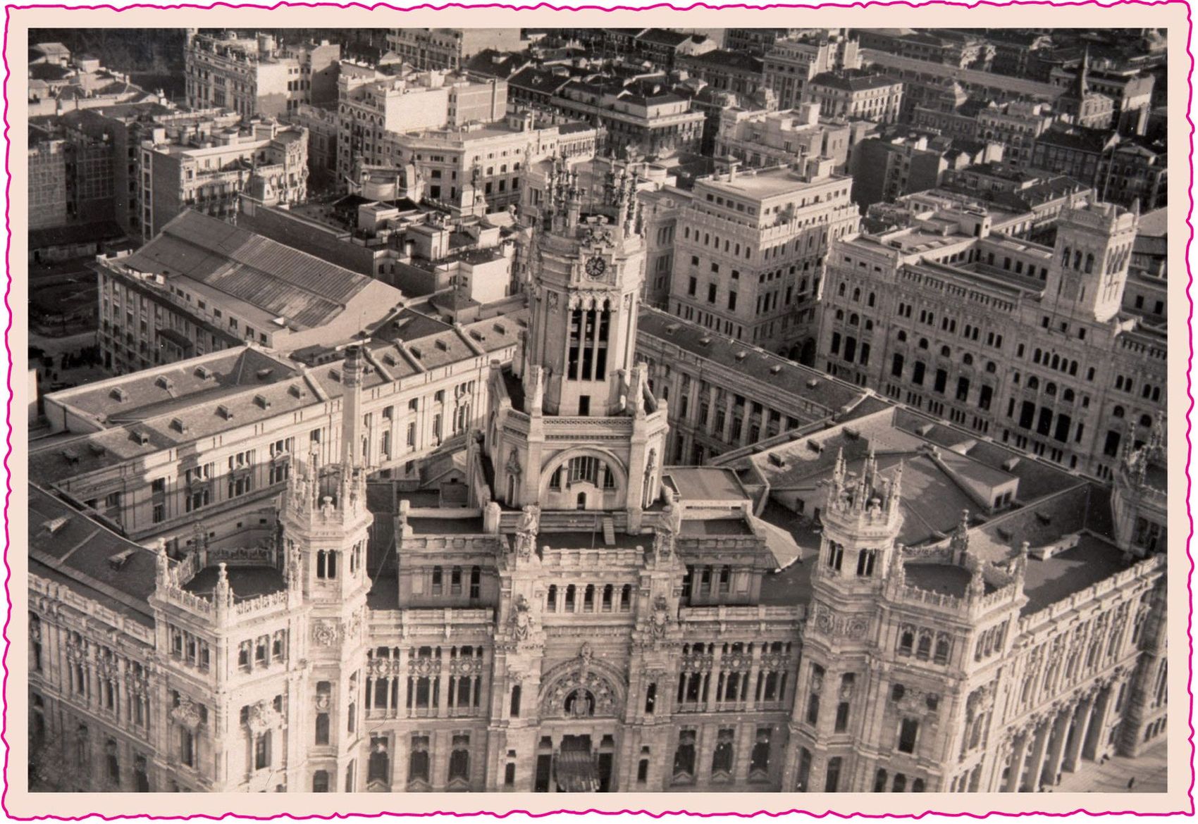 La tarjeta está ilustrada en su anverso con una vista aérea del Palacio de Comunicaciones.