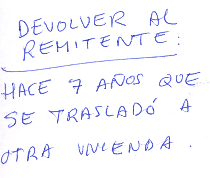 El usuario del buzón recoge la correspondencia del mismo y descubre que la carta es para una persona que no vive allí. Sin más (a saber donde estará el cartero y portero no hay), escribe que hay que devolverla al remitente, que el destinatario real hace siete años que se trasladó a otra vivienda y, sin más, la deposita en el primer buzón de Correos que le pilla a mano.