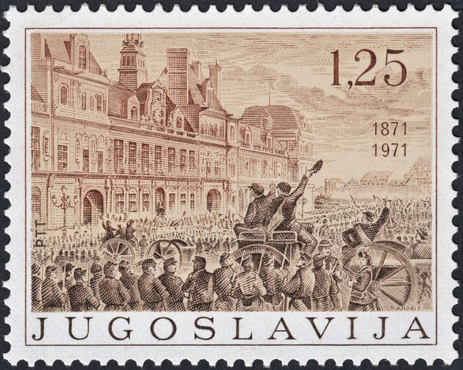 Emitido en 1971, Dragiša Andrić (Belgrado, 1942) miniaturizó con los buriles una lámina que en 1871 ilustró un artículo sobre la Comuna de París en una revista francesa.