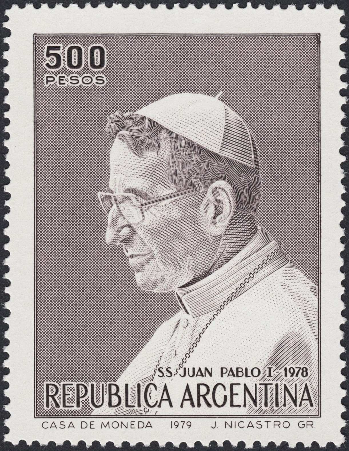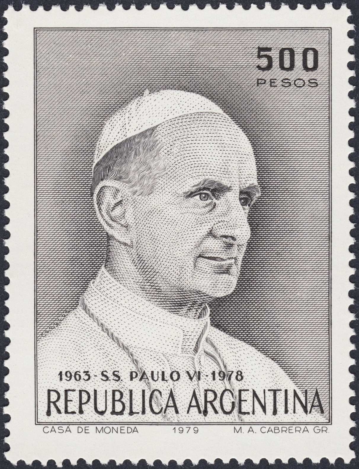 También hemos encontrado sin dificultad la fotografía que termina descomponiendo y grabando Adelma Cabrera en el sello argentino de Pablo VI emitido en 1979.