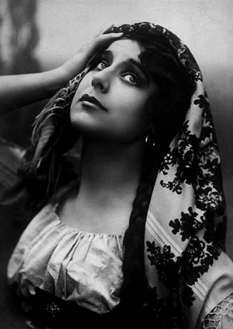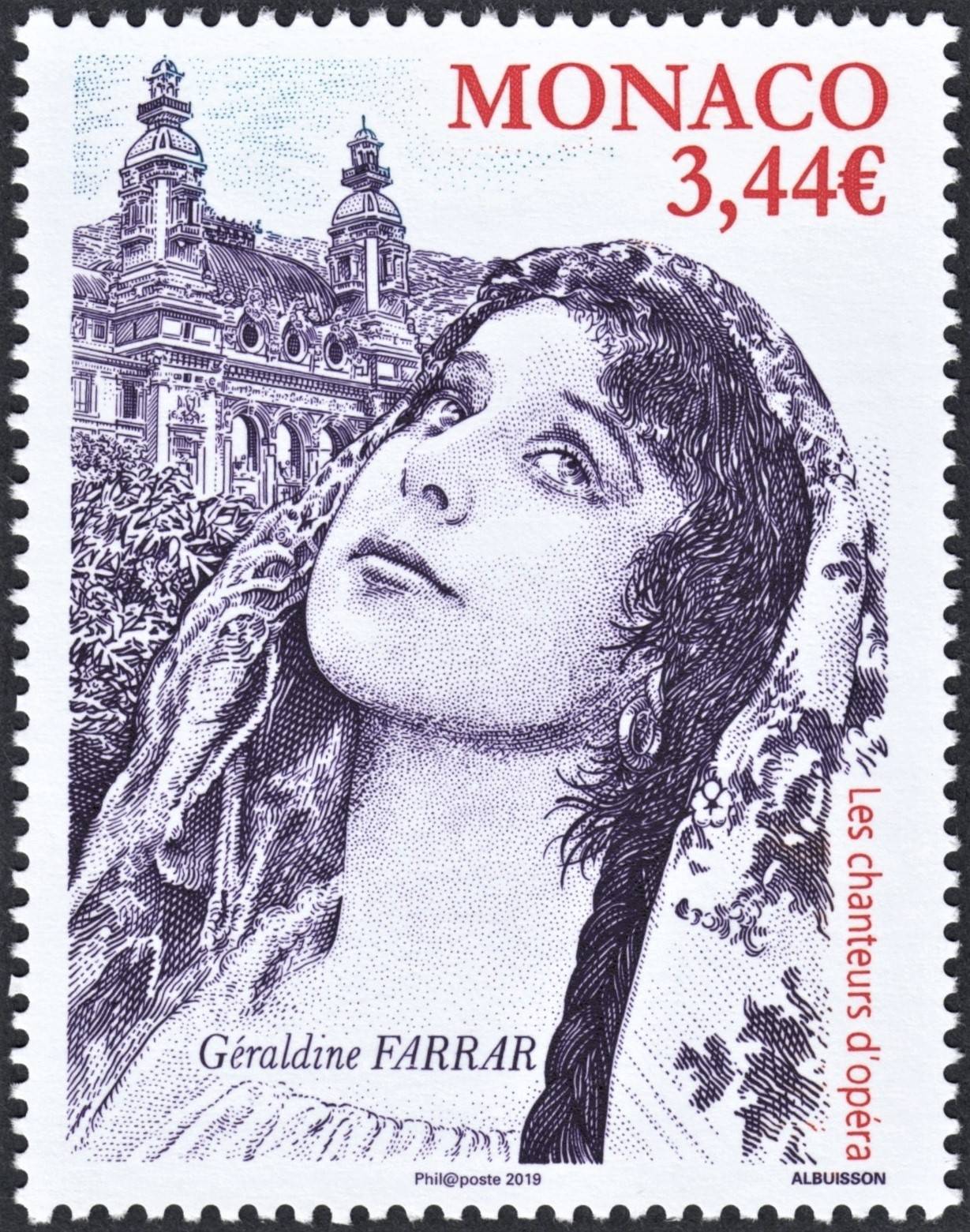 El grabador utiliza como base del diseño la fotografía adjunta de Géraldine Farrar, aparta la mano de la bella soprano y enseguida dispensa un retrato sensitivo y turbador. Espléndido sello del maestro francés.