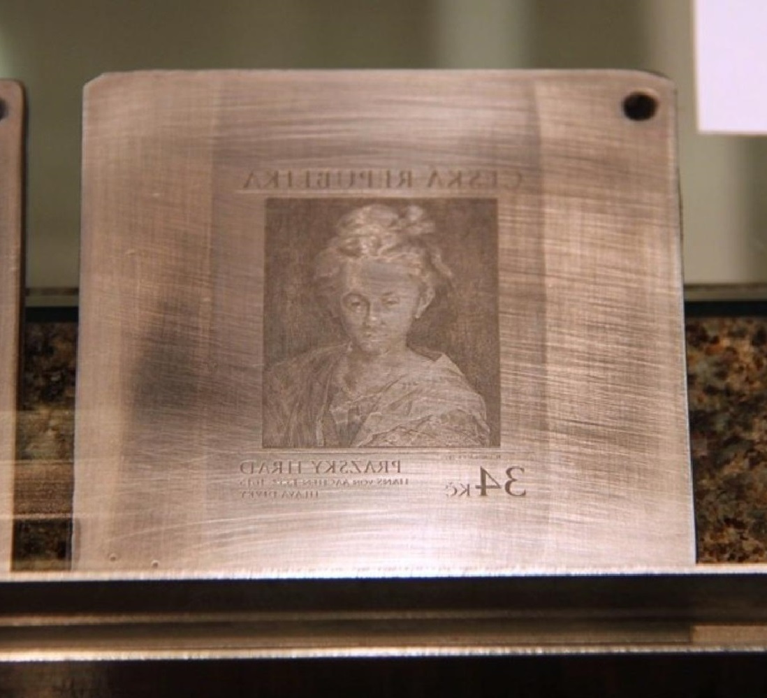 Hasta el año 1989 teníamos un gran pintura de Jasusch que podíamos ver y admirar. Ahora y desde entonces, hay además otra misma y diferente obra que podemos tener y tocar, un sello delicioso que Činovský crea con unos buriles entre las manos y una paleta de pintor en la cabeza.