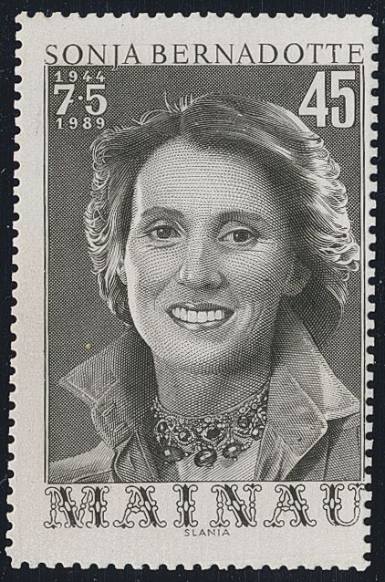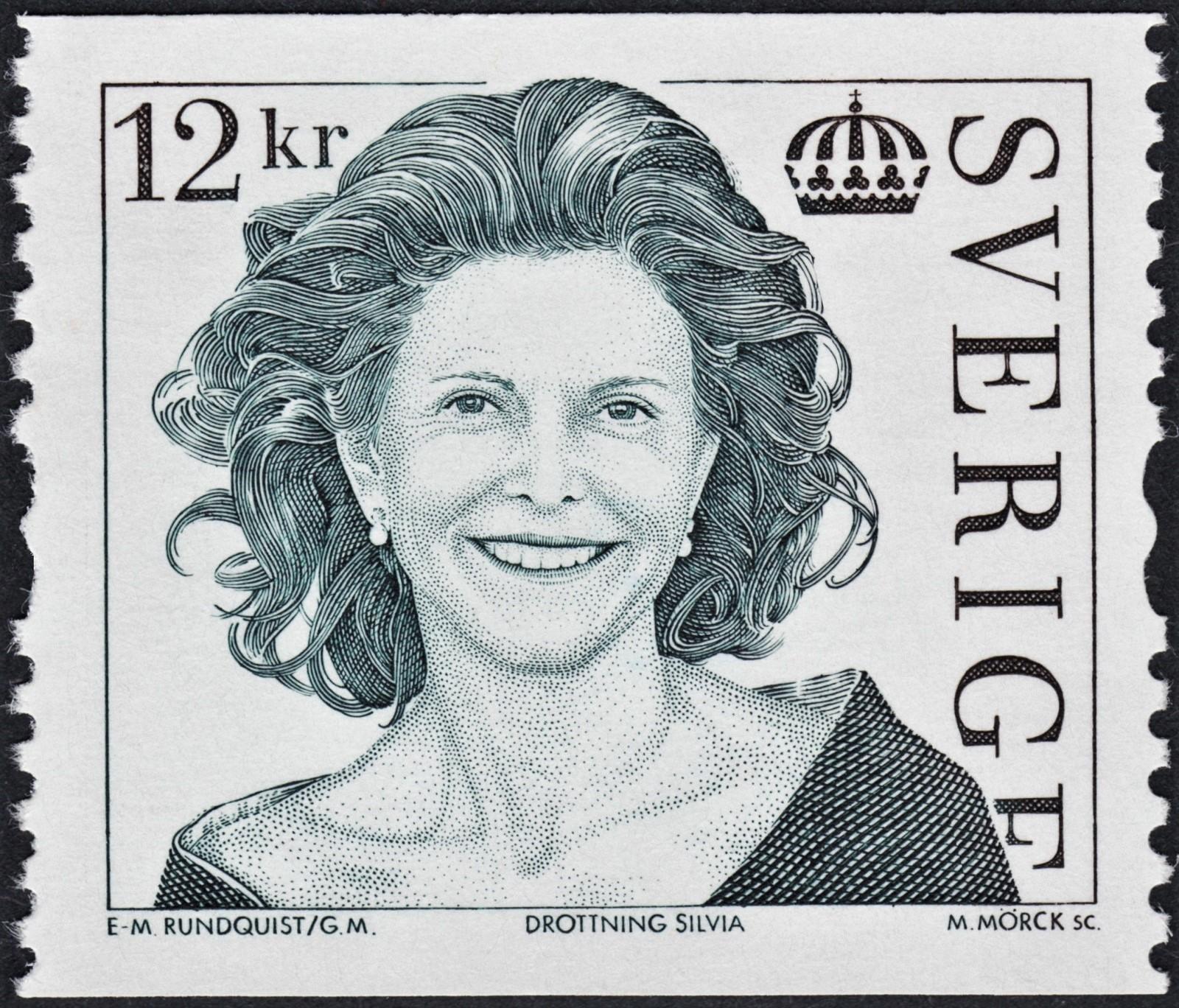 La viñeta que digo de Silvia (1986), quizá sea el mejor retrato de la reina sueca que realizó Slania, para mí mejor que los grabados en varios sellos. En esto, no obstante, acaso también tenga mucho que ver la fotografía usada como base del grabado y el espacio, creo que mayor, del que dispuso Slania.