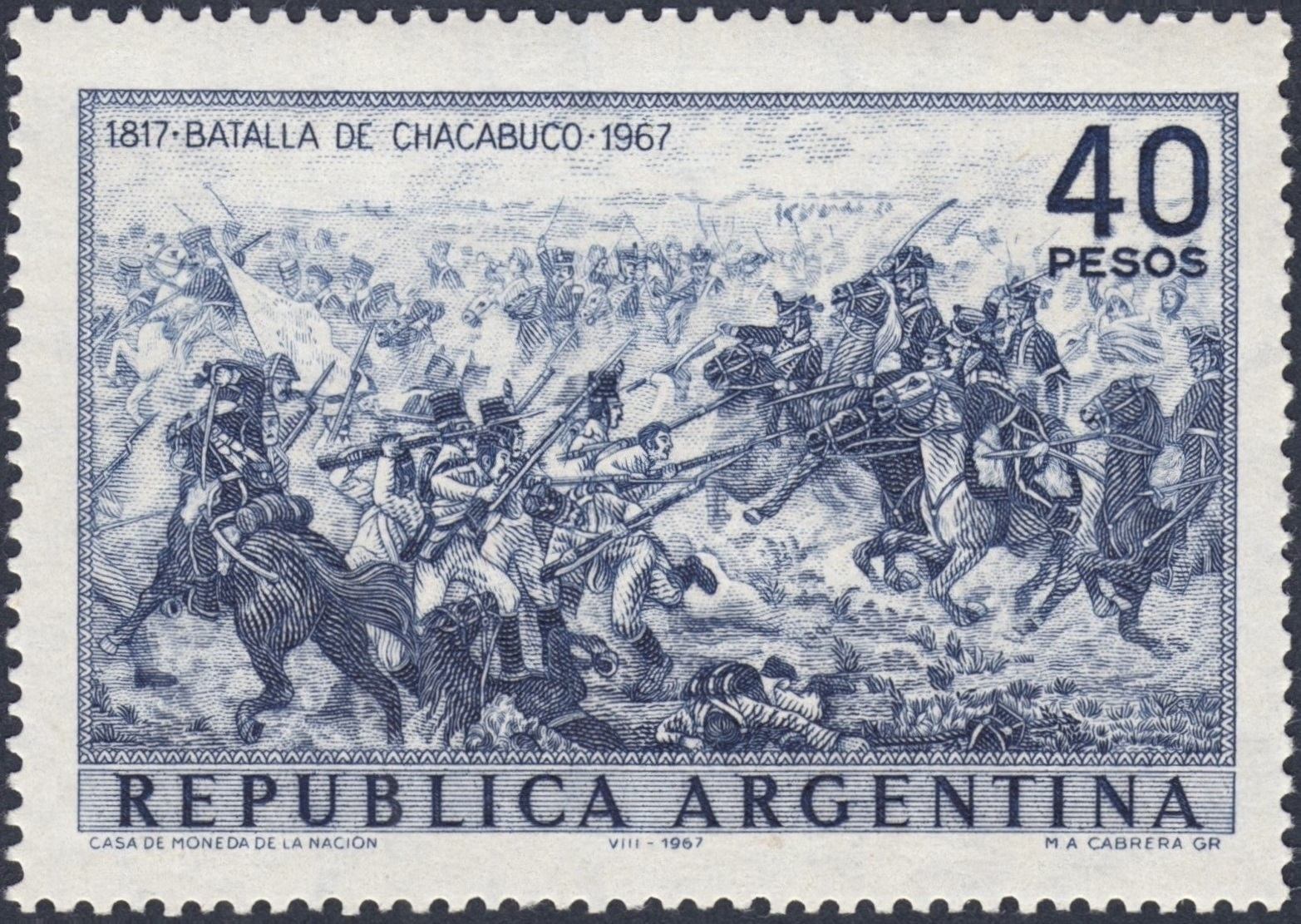 Argentina, 1967, Batalla de Chacabuco. Sello grabado por Adelma Cabrera. Calcografía