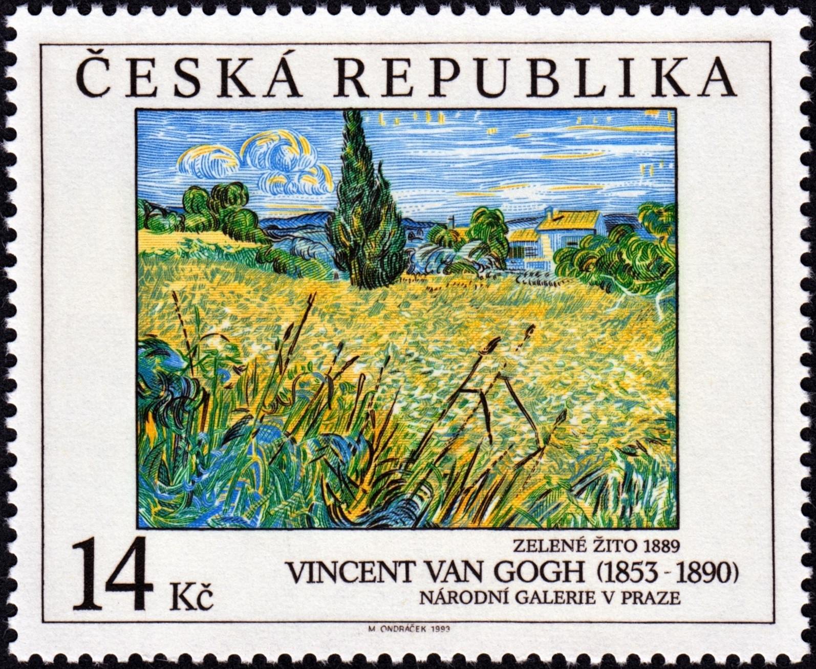 República Checa, 1993, Arte. Vincent van Gogh, “Campo de trigo verde con ciprés”. Sello diseñado y grabado por Miloš Ondráček. Calcografía