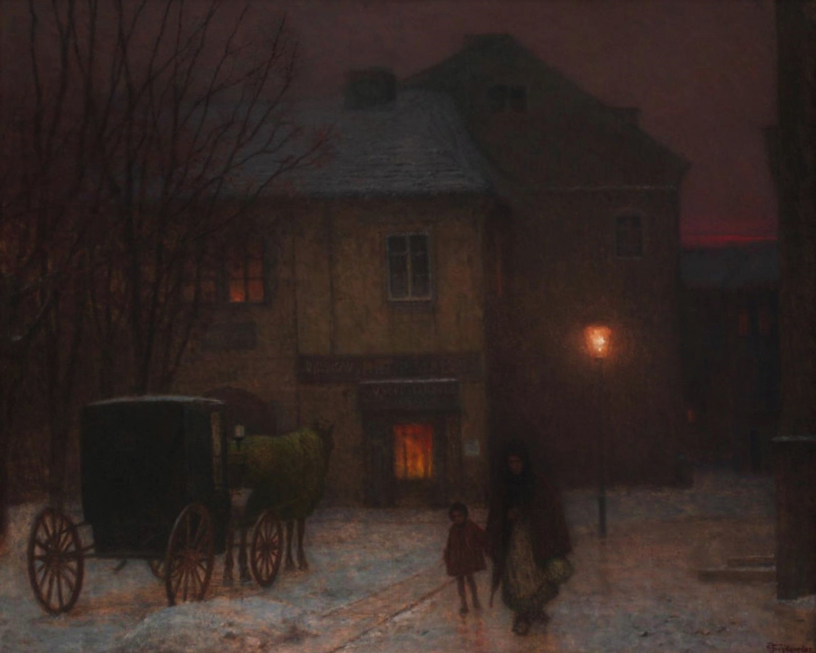 ”Noche de invierno en la ciudad”, pintura de Jakub Schikaneder