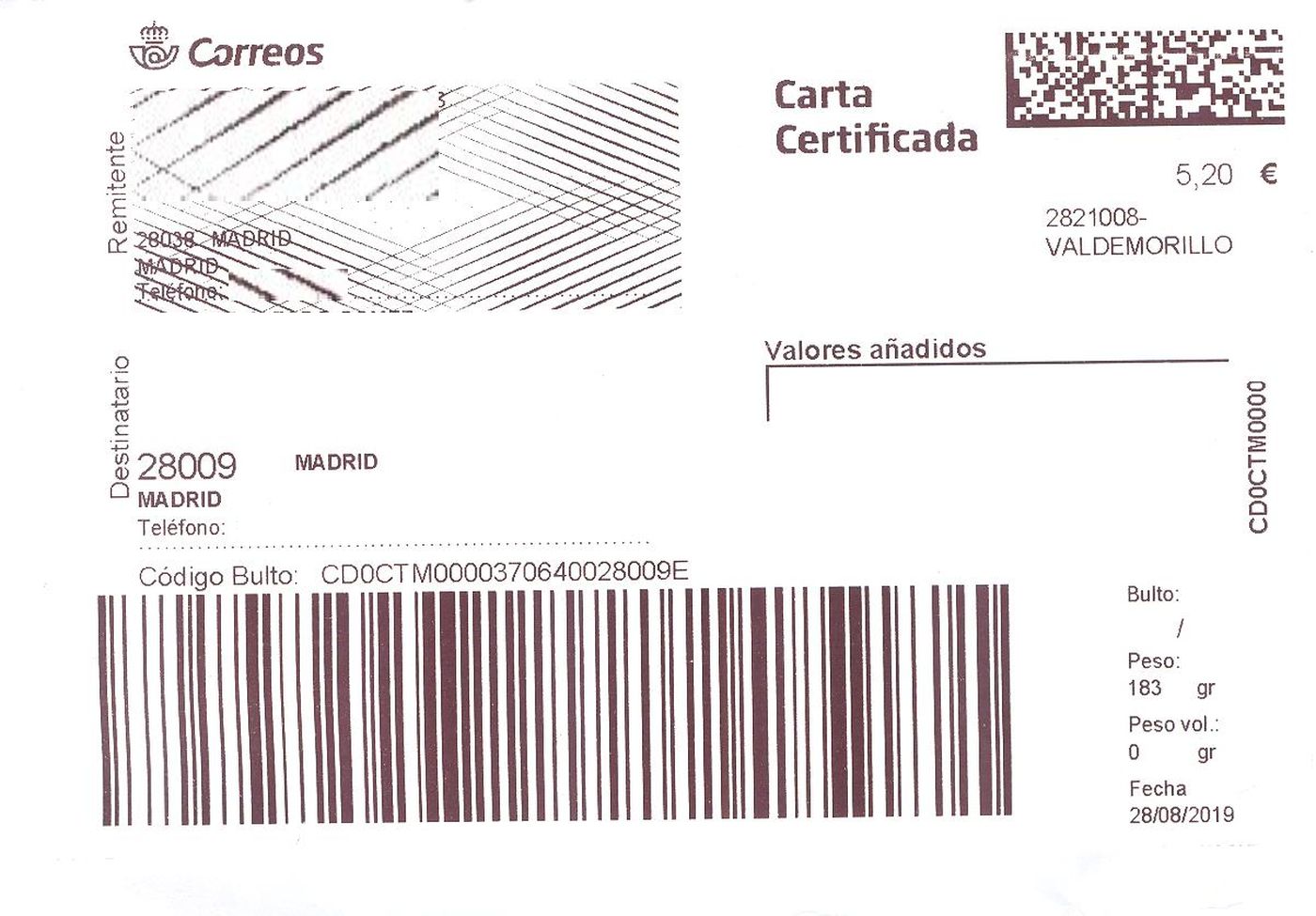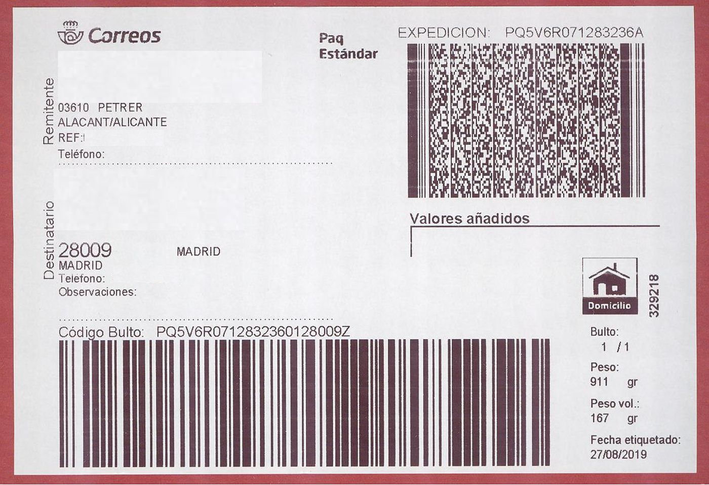 Como ya expliqué, es una etiqueta obtenida en la oficina de Correos, de un envío pre registrado por el remitente.