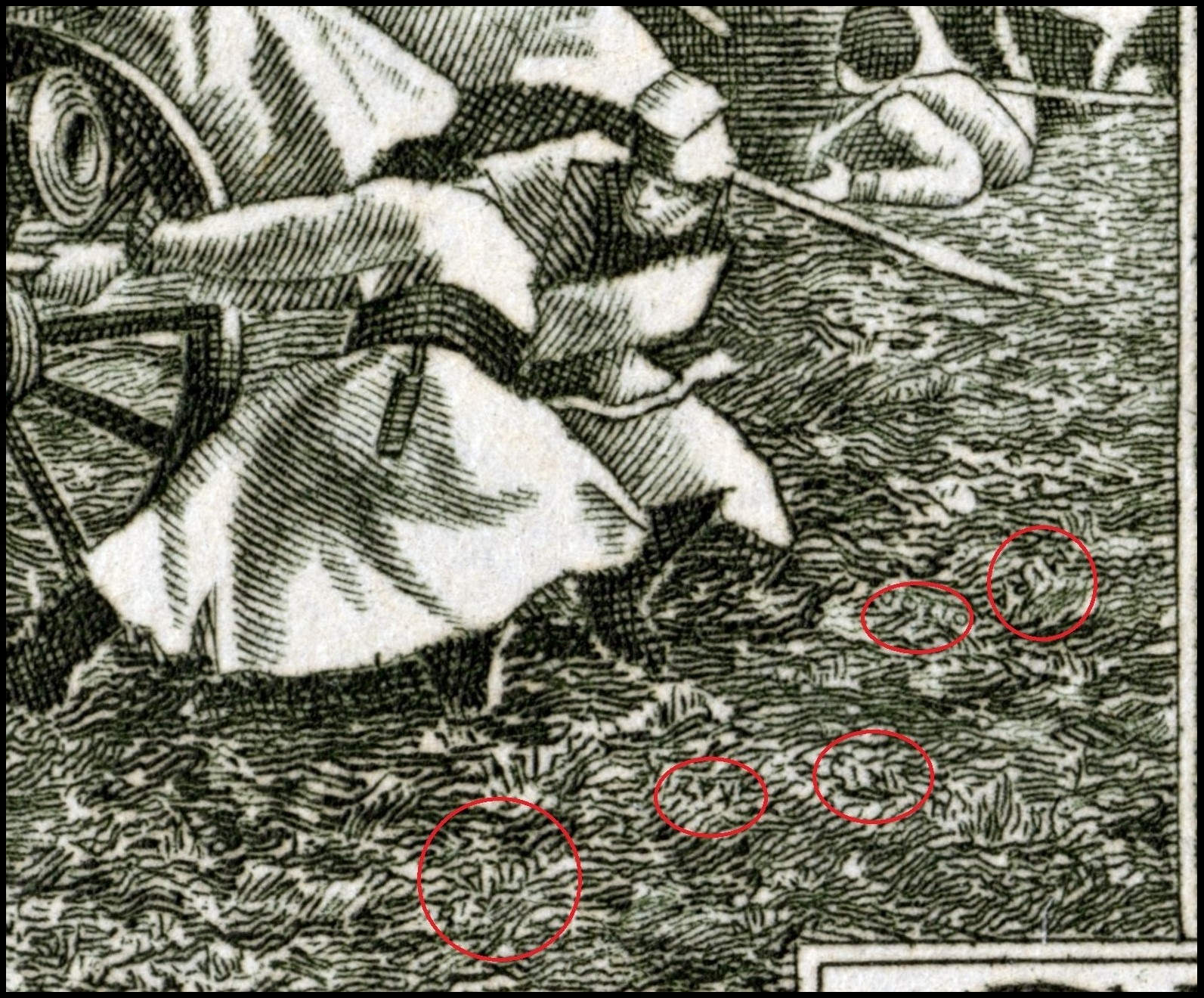 Detalle del sello francés, con los seis colores impresos en calcografía indirecta o reporte (amarillo, rojo y naranja) y calcografía directa (negro, azul y verde oscuro), transferidos desde dos cilindros distintos