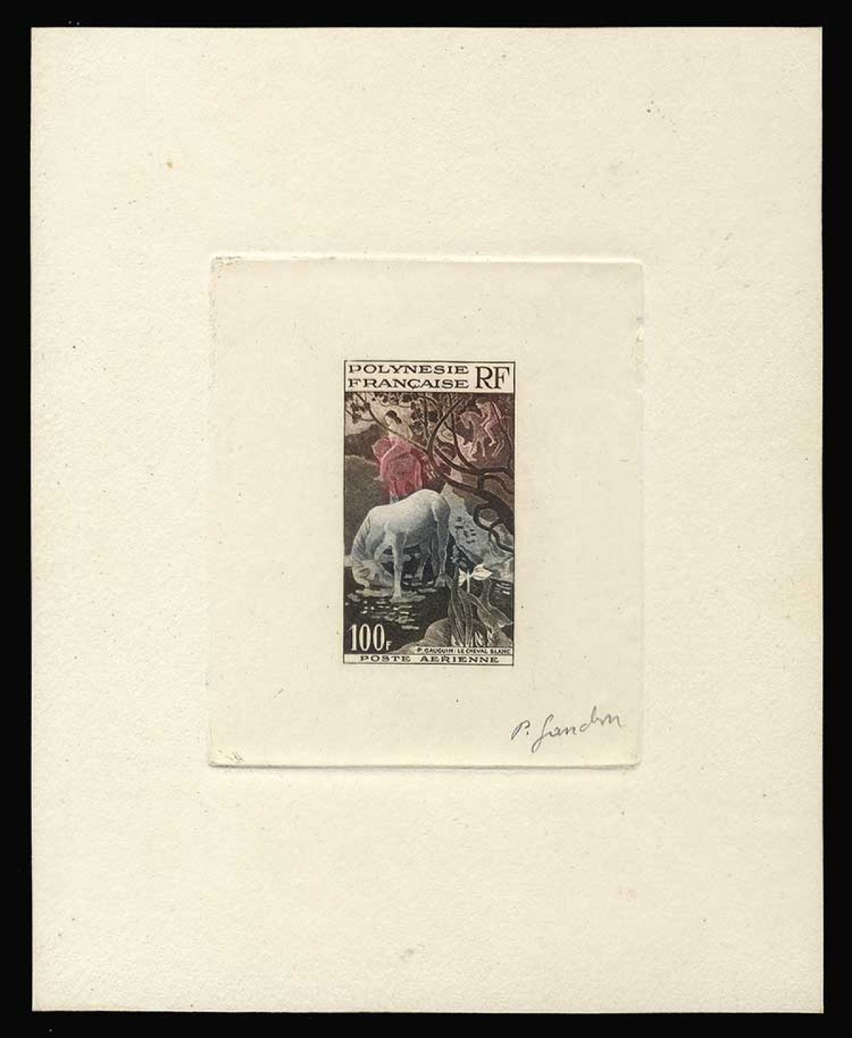 Por ser uno de los más bellos sellos del mundo, recuperamos el caballo blanco de Gauguin (Polinesia Francesa, 1958) expuesto en la página anterior para añadir un par de cosas más. La primera es incidir en la muy segura autoría de Pierre Gandon, tanto por el estilo en sí mismo del grabado, como por las varias pruebas firmadas que hay por la red, entre ellas esta que exponemos y que parece una prueba de punzón coloreada a mano, quizá comercial, similar a la enseñada anteriormente y que entonces erróneamente calificamos sin más de prueba de impresión.