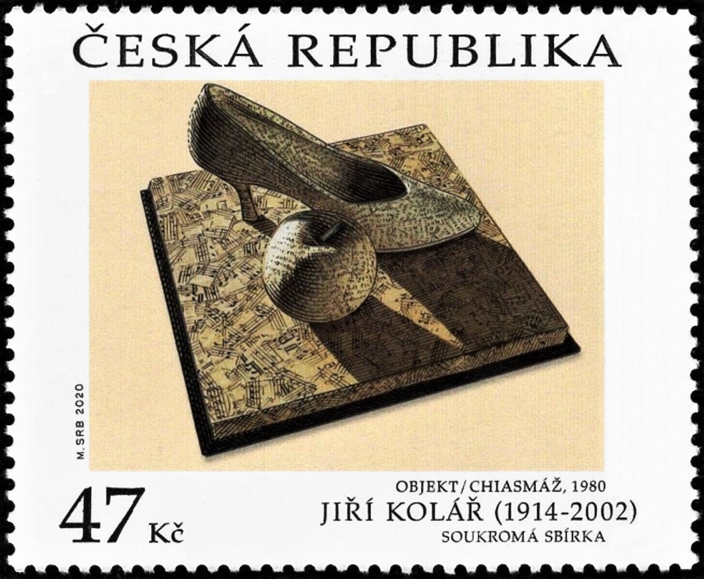 República Checa, 2020, Arte. Jiří Kolář, sugerente objeto collage de 1980. Sello grabado en una sola placa por Martin Srb, impreso en combinación de calcografía (negro) y offset (resto de colores)