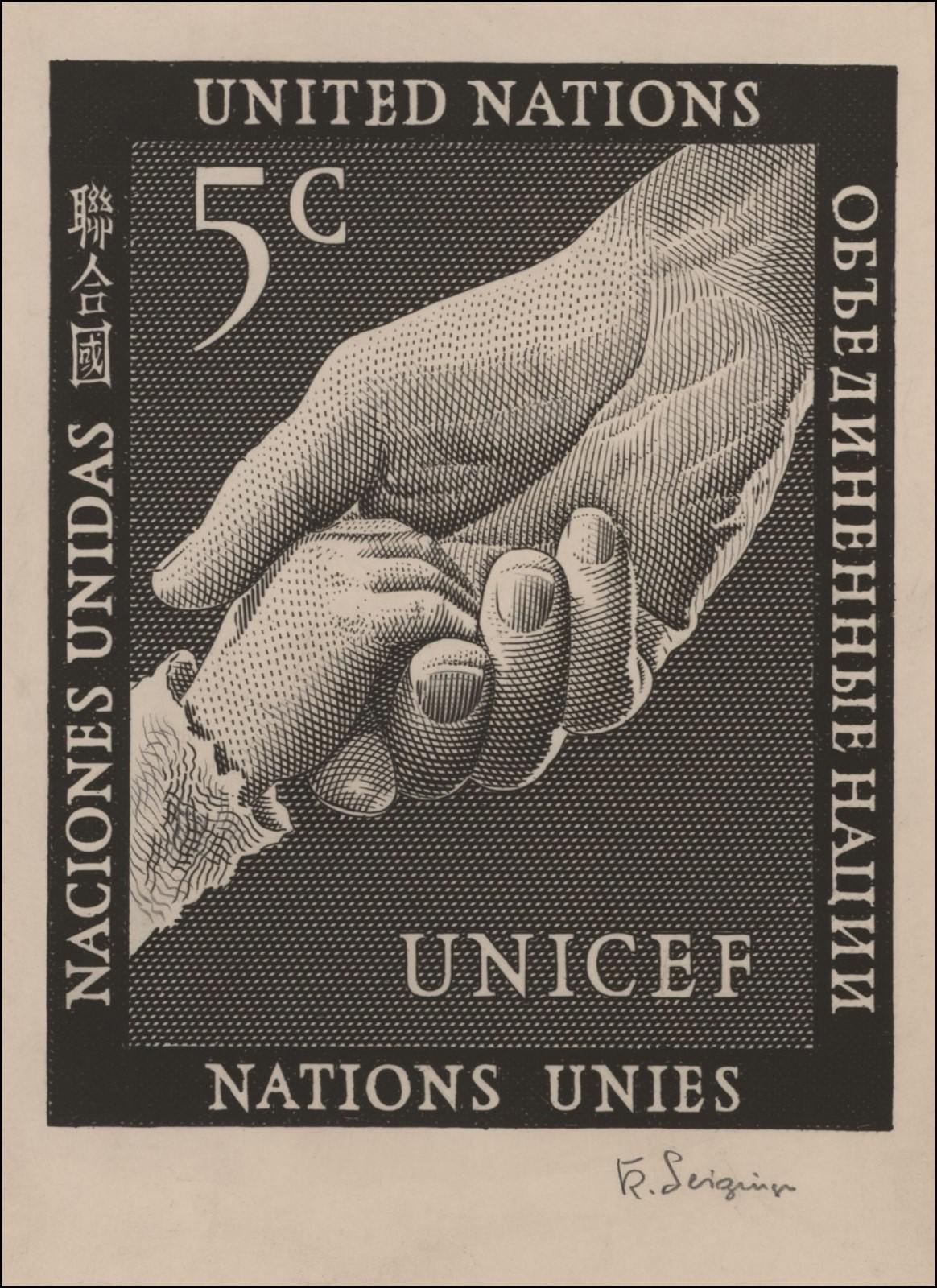 El sello de Naciones Unidas de 1951 (Unicef) fue grabado finalmente por Samuel Louis Hartz, pero Karl Seizinger, compañero entonces de aquél en Enschedé, estuvo a punto de incidirlo y llegó a realizar un diseño específico de grabado.