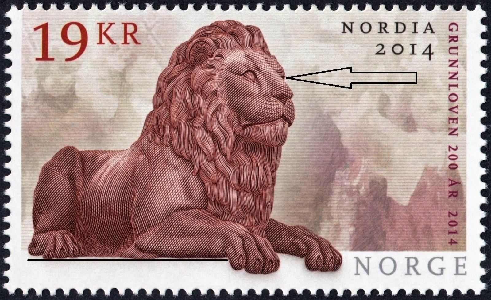 Aunque el diseño general del sello lo dispuso Enzo Finger, el león y su exacta posición es cosa de Sverre Morken. Y aquí está la clave de su belleza, en la perspectiva justa de la escultura. La perpendicularidad inferior izquierda acrecienta en nuestro mirar el relieve majestuoso de las garras delanteras, y la ceja entrevista confiere sensación de totalidad al suprimir el solo perfil lateral, al cabo ordinario y ocioso.