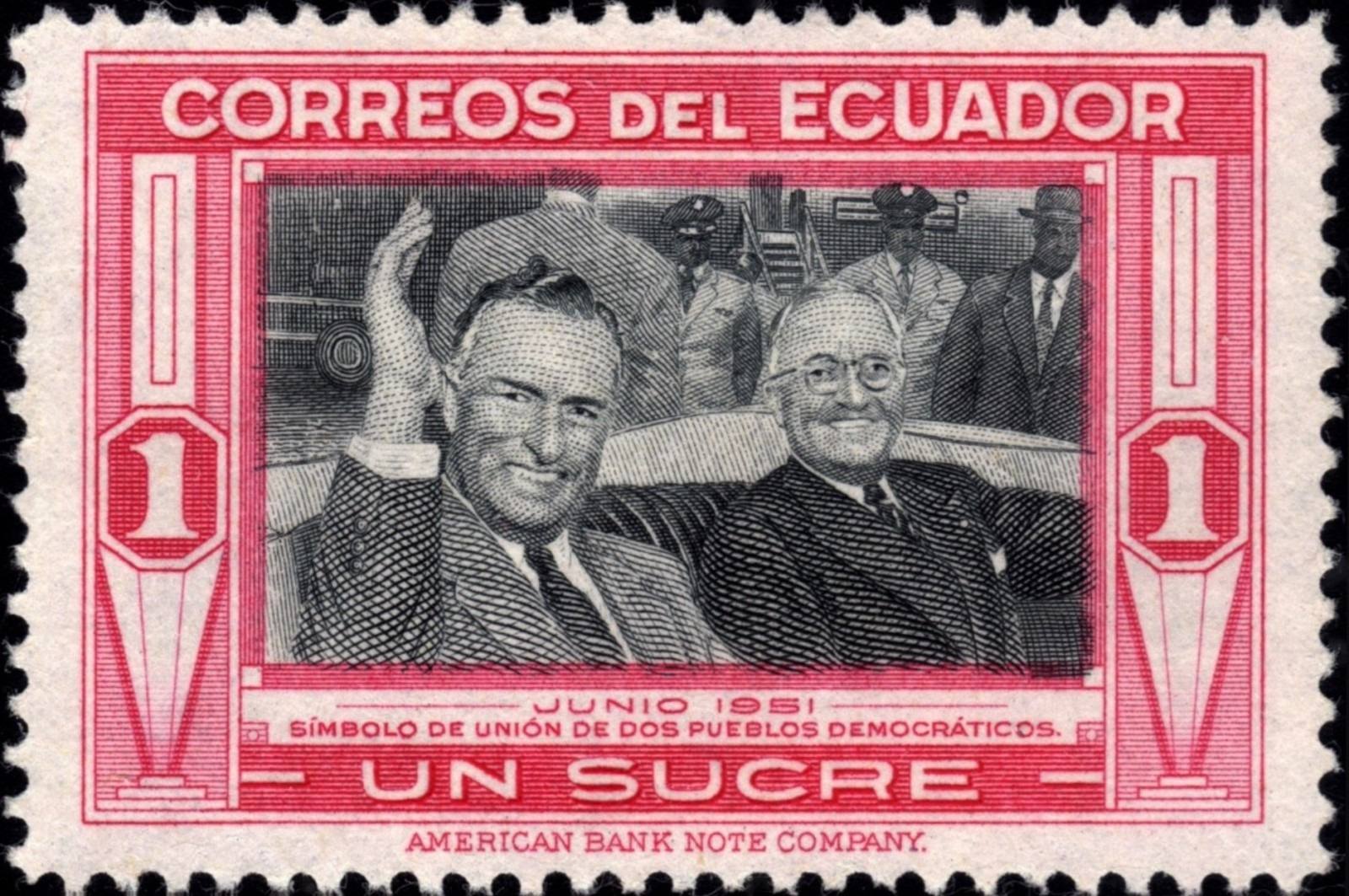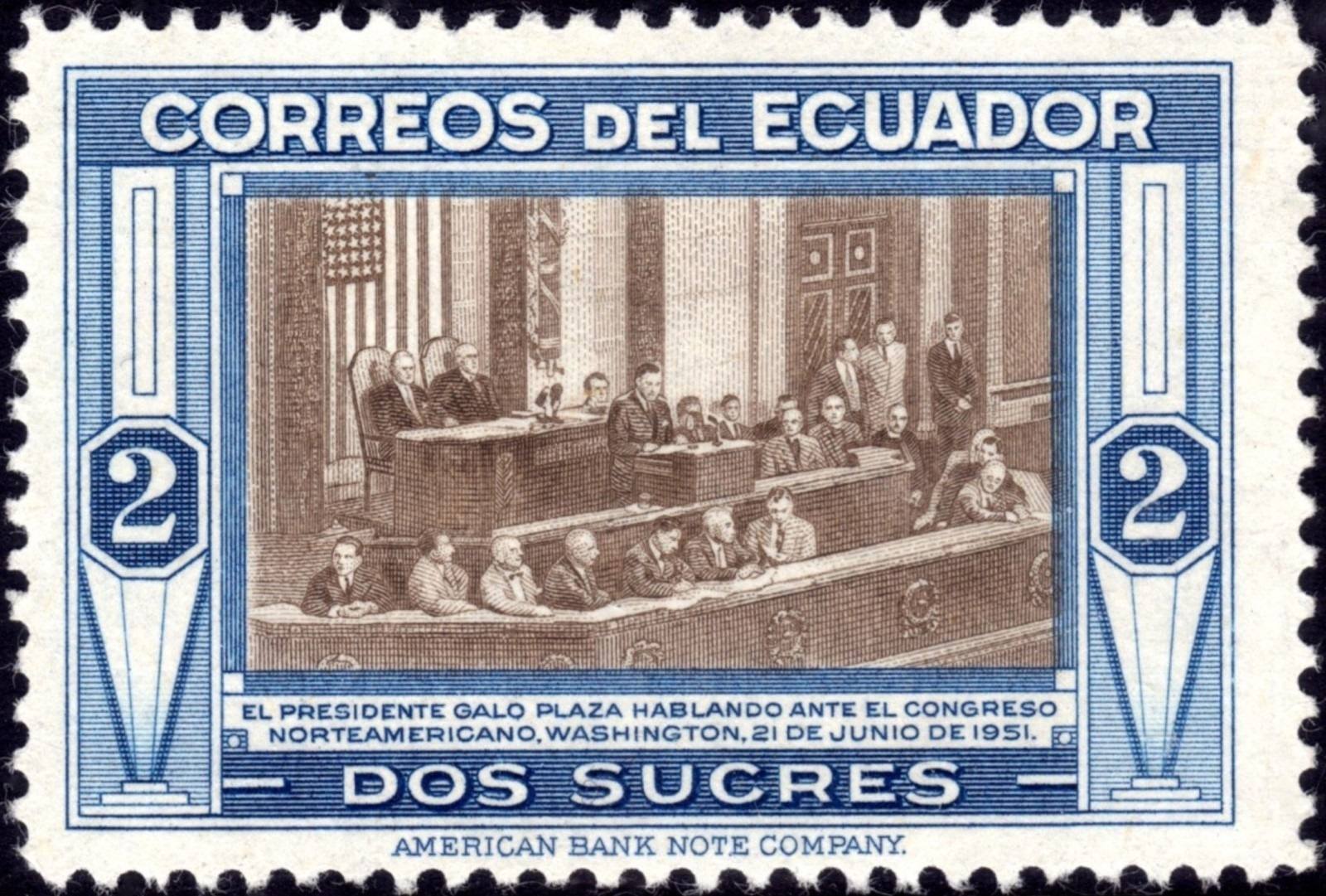 La viñeta del otro sello del presidente Plaza emitido por Ecuador en 1952, realmente excepcional, fue grabada por Joseph Keller (1903-1987).