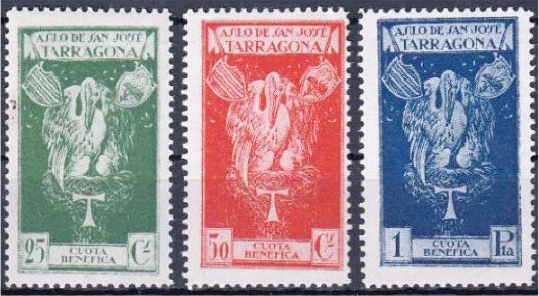 Esta vinyeta del Asilo de San José de Tarragona verde 25 ct, existe también en rojo 50 ct y azul 1 pt.