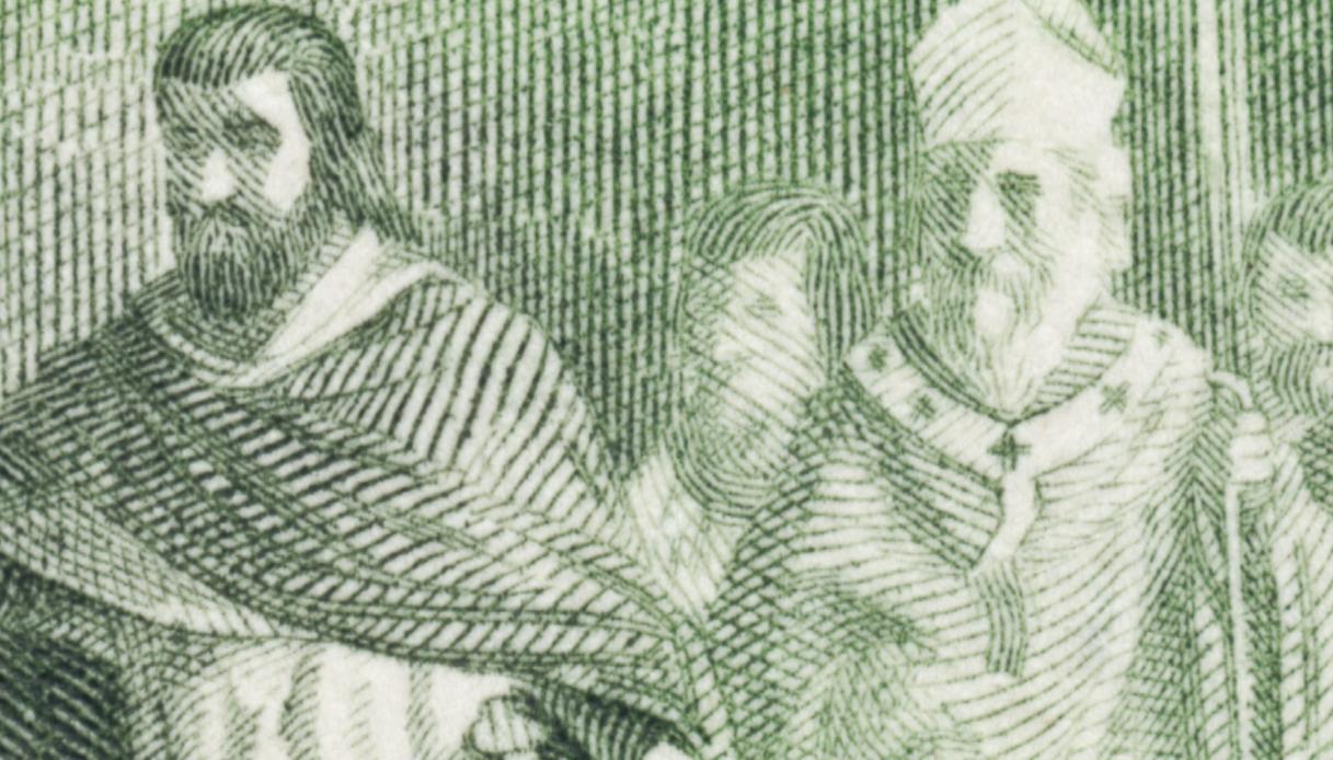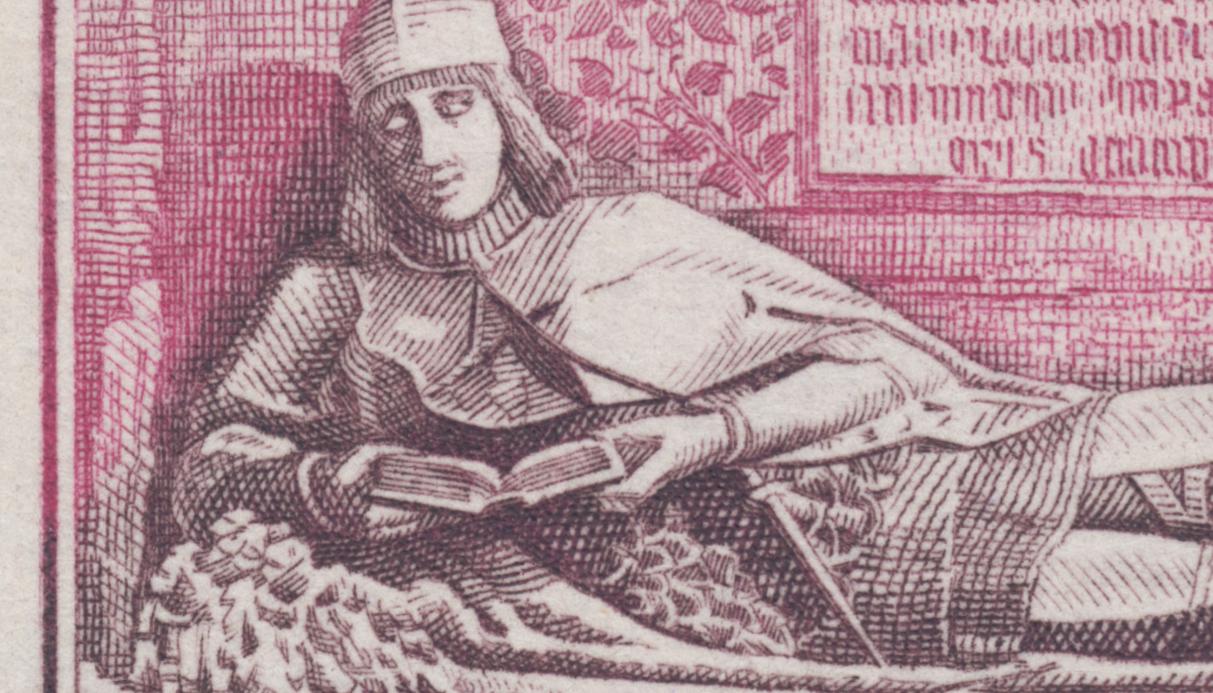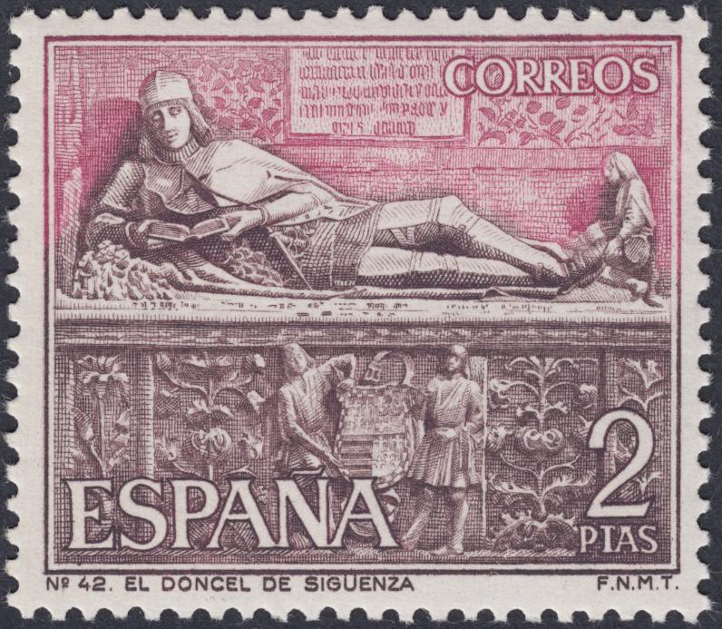 El sepulcro de Martín Vázquez de Arce, en una de las capillas de la catedral de Sigüenza, ha inspirado grandes palabras a no pocos escritores españoles, sin duda fascinados por lo que la figura representa: valentía y meditación. Ardor guerrero y lectura pausada. También inspiró a José Luis Sánchez Toda uno de sus últimos grabados, para este gran sello emitido en 1968. Gran trabajo del maestro, armonioso y sereno, espléndido grabado.