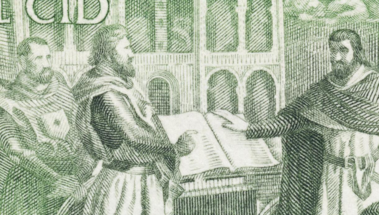 De unos años antes es la serie dedicada al Cid, sin duda una de las más emblemáticas del II Centenario. Los cuatro grabados fueron realizados por José Luis Sánchez Toda, entonces en plena madurez. Mostramos El juramento en Santa Gadea, a partir de una obra de Marcos Hiráldez Acosta de 1864, expuesta en el Senado de Madrid.