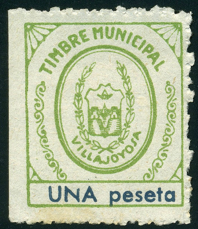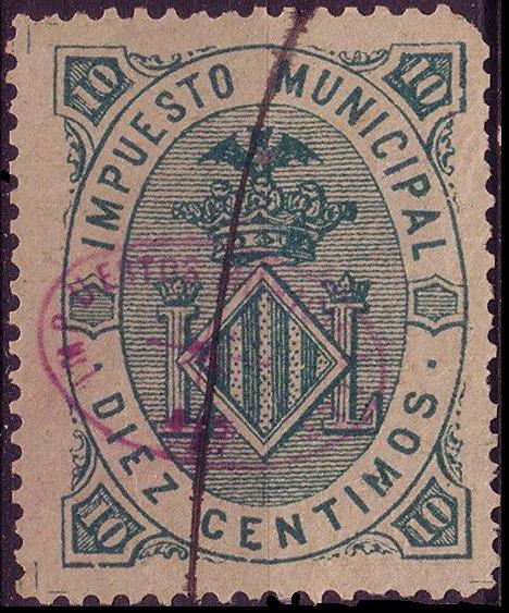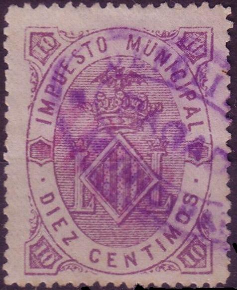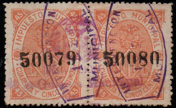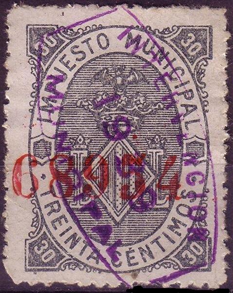 Después existe otra sobrecarga con tinta violeta y óvalo sencillo con texto: "IMPUESTOS MUNICIPALES" y una estrella en el centro.