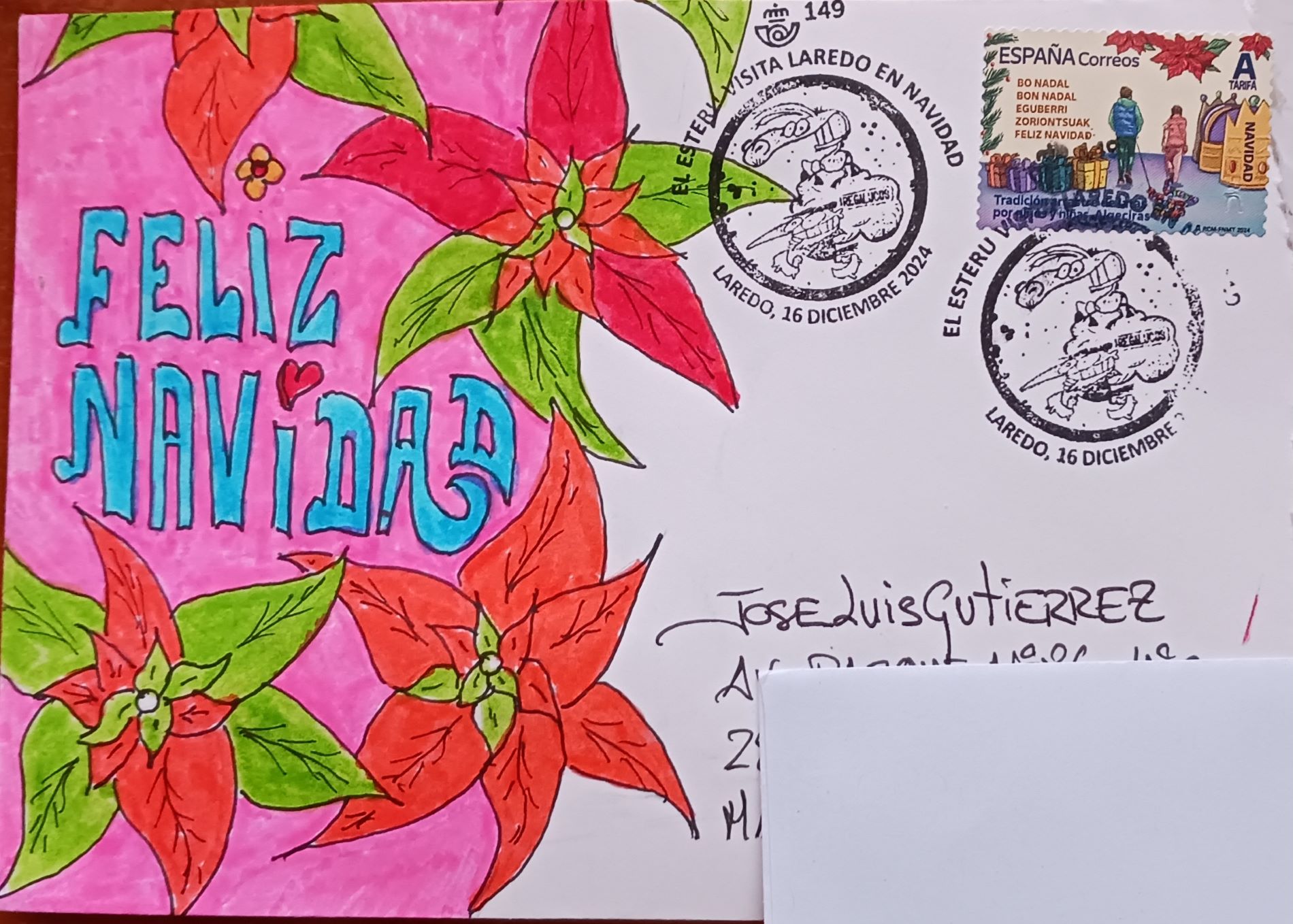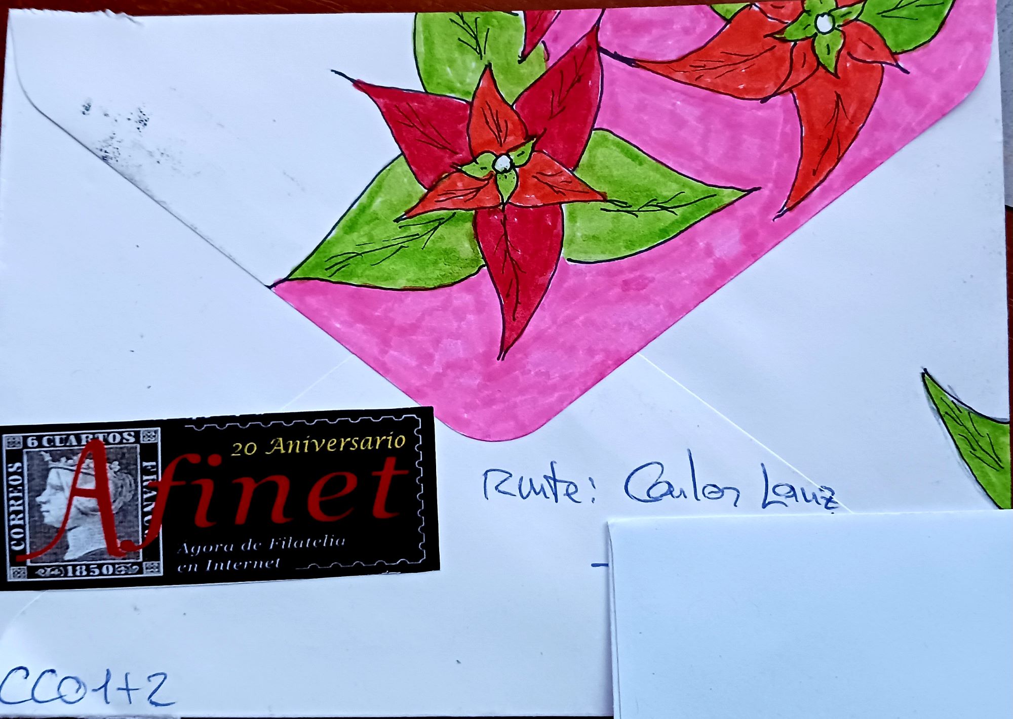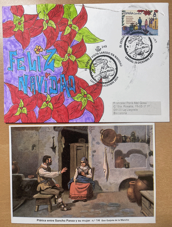 El amigo Carlos ha enviado el prometido sello de Navidad tarifa A de este año, dentro de nuestro CCO. Aunque seguramente lo tenemos en multitud de envíos, él aprovecha a enviarlo con el curioso matasello de "El Esteru visita Laredo en Navidad". Además la decoración a mano del sobre con esa preciosa ponsetia (o eso quiero yo ver ahí) lo hace aún mas bello. Sería digno de poner la imagen en el hilo del Arte Postal, pero vamos a dejarla aquí, que luce igual de bien. Además incluye tarjeta con entrañables palabras para felicitar las fiestas. Gracias, amigo Carlos.