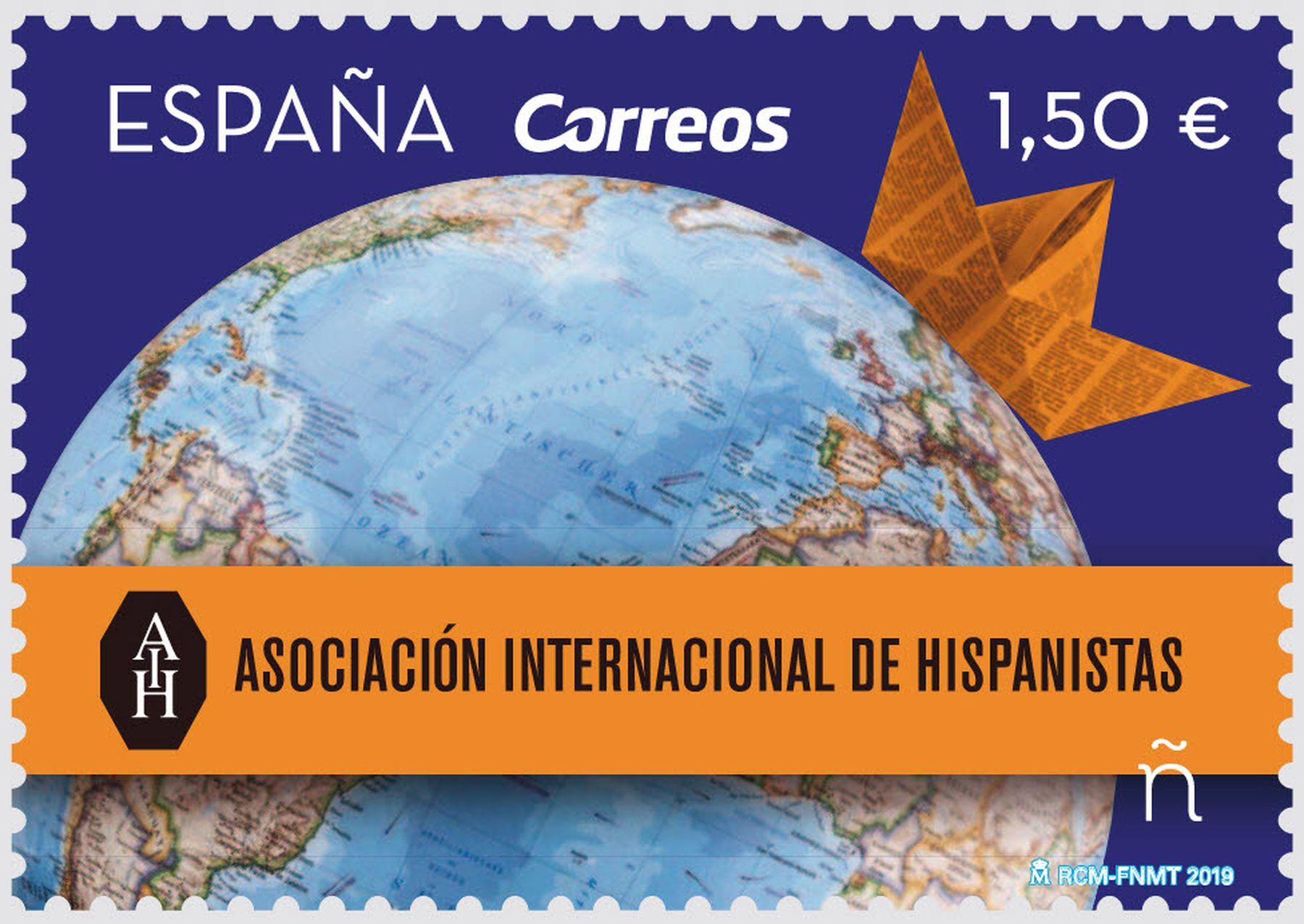 El sello dedicado la Asociación Internacional de Hispanistas, presenta una ilustración de una bola del mundo surcada por un barquito de papel recordando aquellos tiempos donde todo lo hispano dominaba el mundo.
