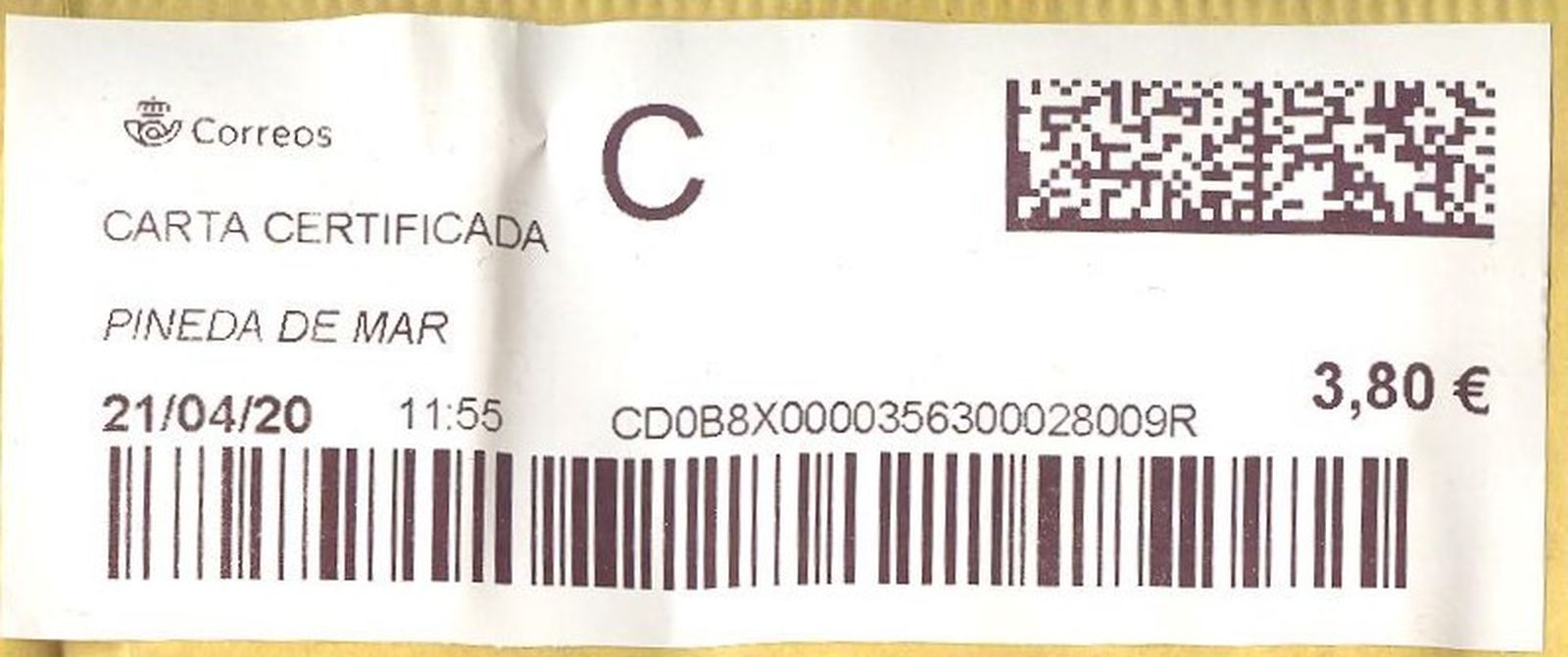 Etiqueta térmica digital. Nuevo Correos. Pineda de Mar. Carta certificada. 2020-04-21. 11.55. 4,1x10. 3,80 euros. Baja.jpg