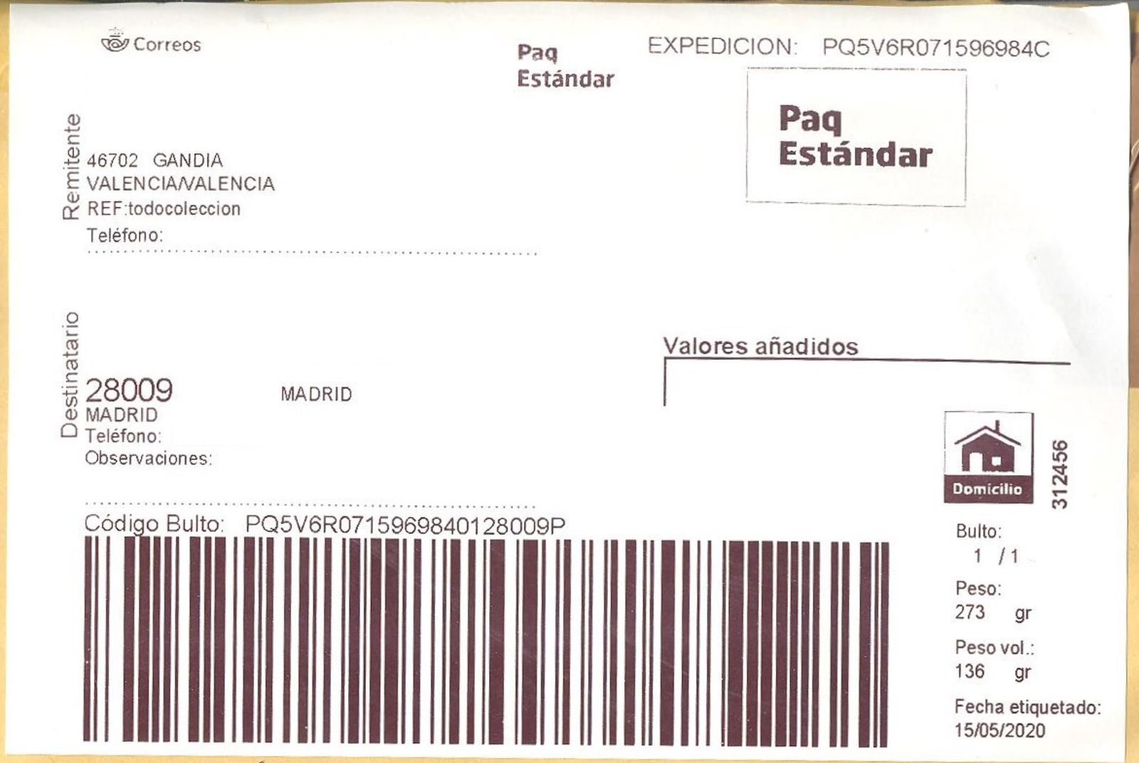 Etiqueta Grande. Nuevo Correos. Paq Estándar. No indica (Gandía, sin precisar). 312456. Domicilio. Sin franqueo. 10x14,6. 2020-05-15. Baja.jpg